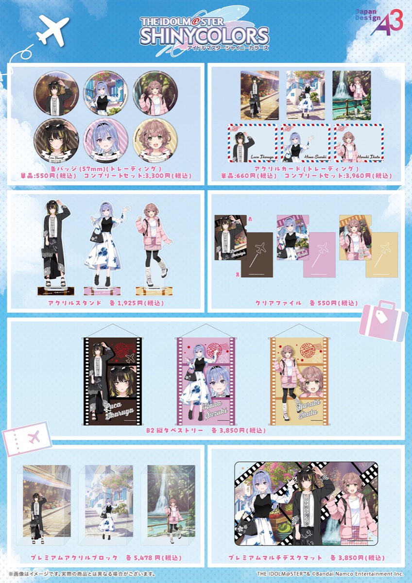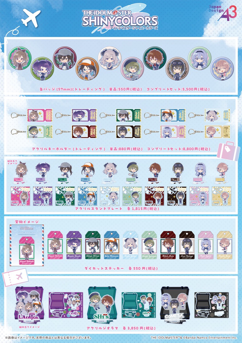「アイドルマスター シャイニーカラーズ」ポップアップストアでは、おでかけがテーマの新規描き下ろしやミニキャライラストを使用した新作グッズが多数販売される。