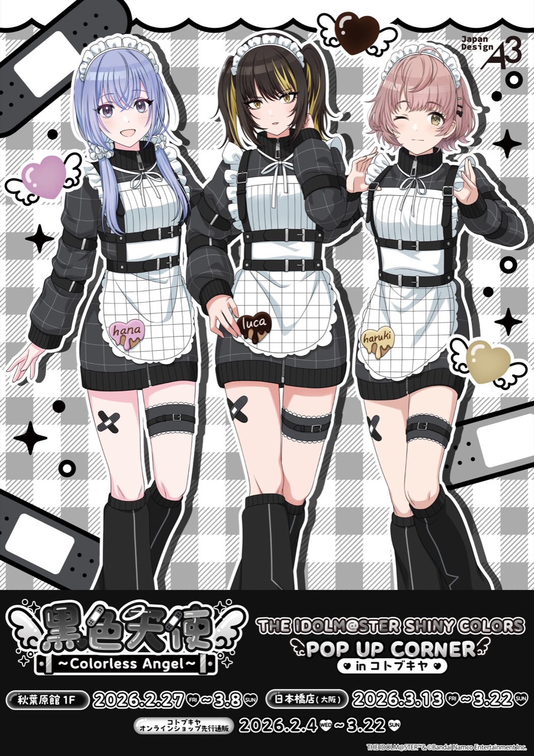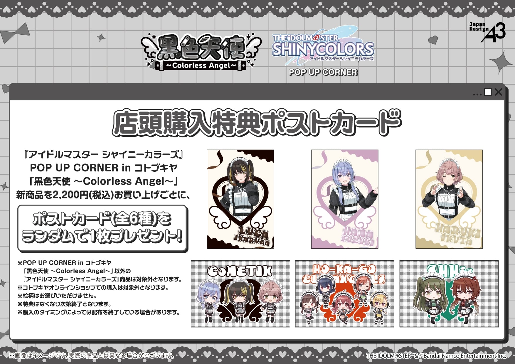 「アイドルマスターシャイニーカラーズ」ポップアップストアでは、ツインテールとカチューシャ姿が可愛らしい斑鳩ルカ(いかるが るか)・鈴木羽那(すずき はな)・郁田はるき(いくた はるき)たちの、描き下ろしイラスト『黒色天使 ~Colorless Angel~』を使用した新作グッズが多数販売される。