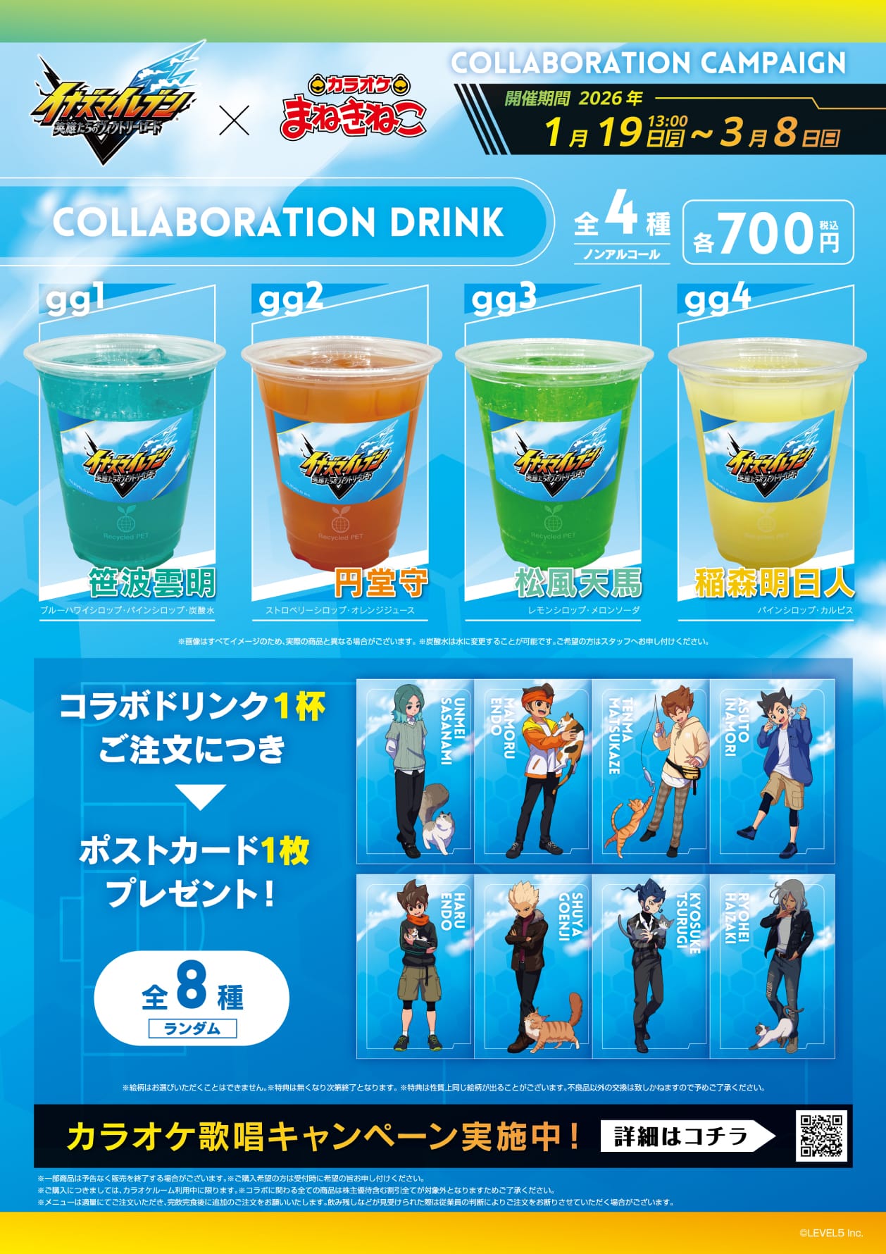 2026年1月19日より全国のカラオケまねきねこにて開催される「イナズマイレブン」コラボでは、笹波雲明・円堂守・松風天馬・稲盛明日人たちをイメージしたコラボドリンクが登場!