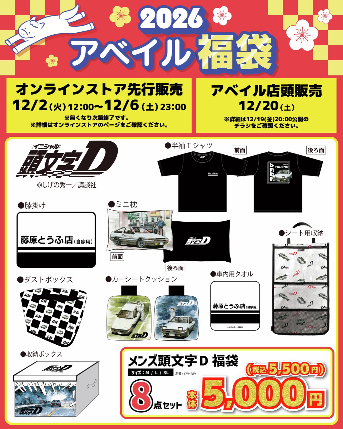 2025年12月20日より全国のアベイルにて、「頭文字D」の「半袖Tシャツ」「ダストボックス」「シート用収納」「ミニ枕」「車内用タオル」「カーシートクッション×2」「ひざ掛け」「収納ボックス」が収録された福袋が登場!