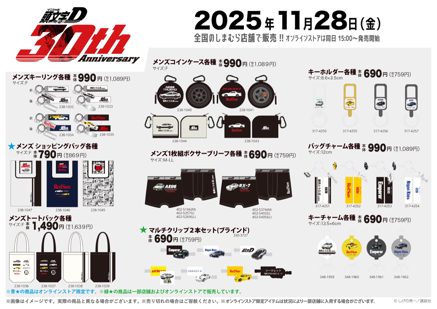 2025年11月28日より全国のファッションセンター「しまむら」と「しまむらオンライン」にて、「頭文字D」のアパレルアイテムやコラボグッズを順次発売!
