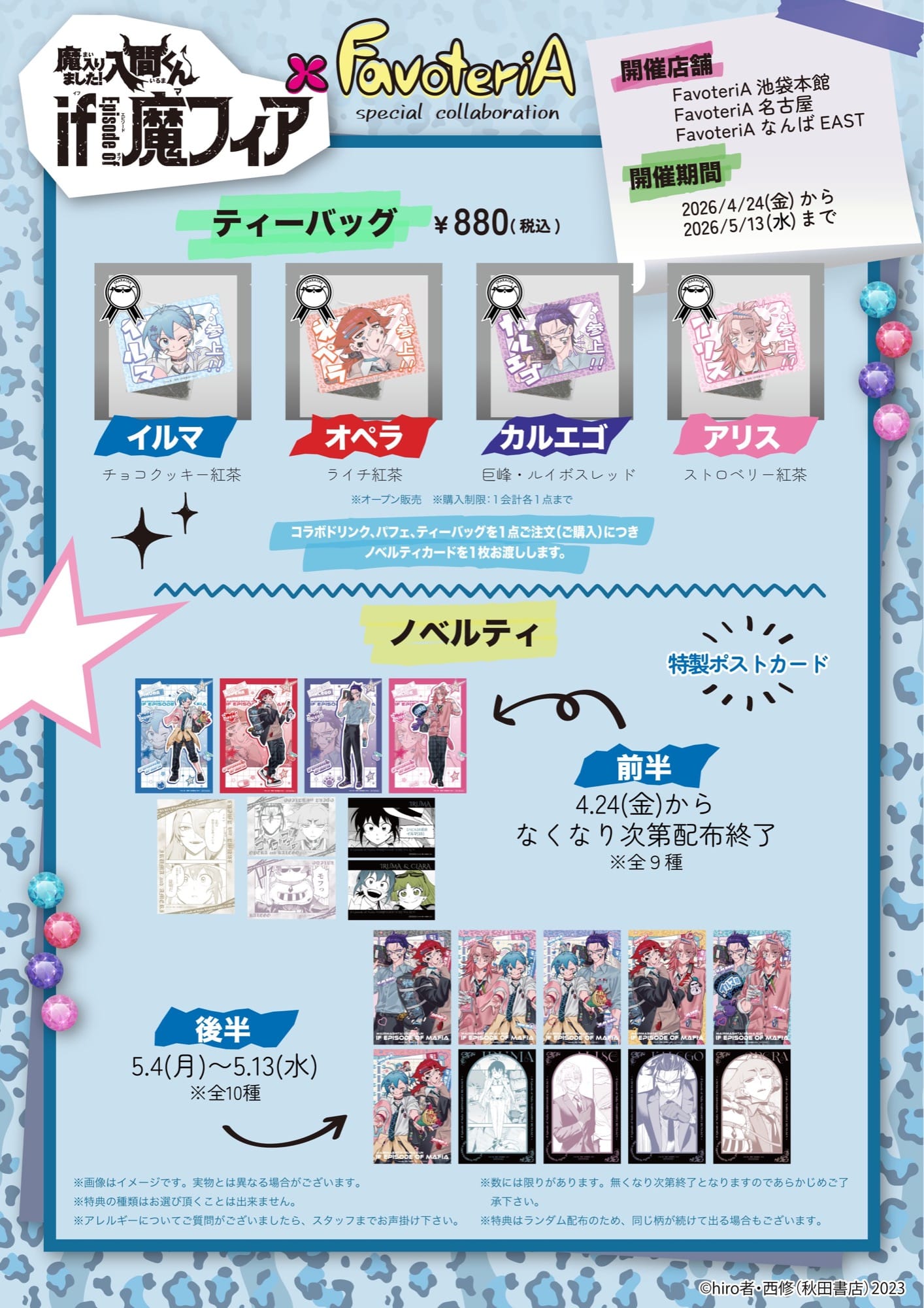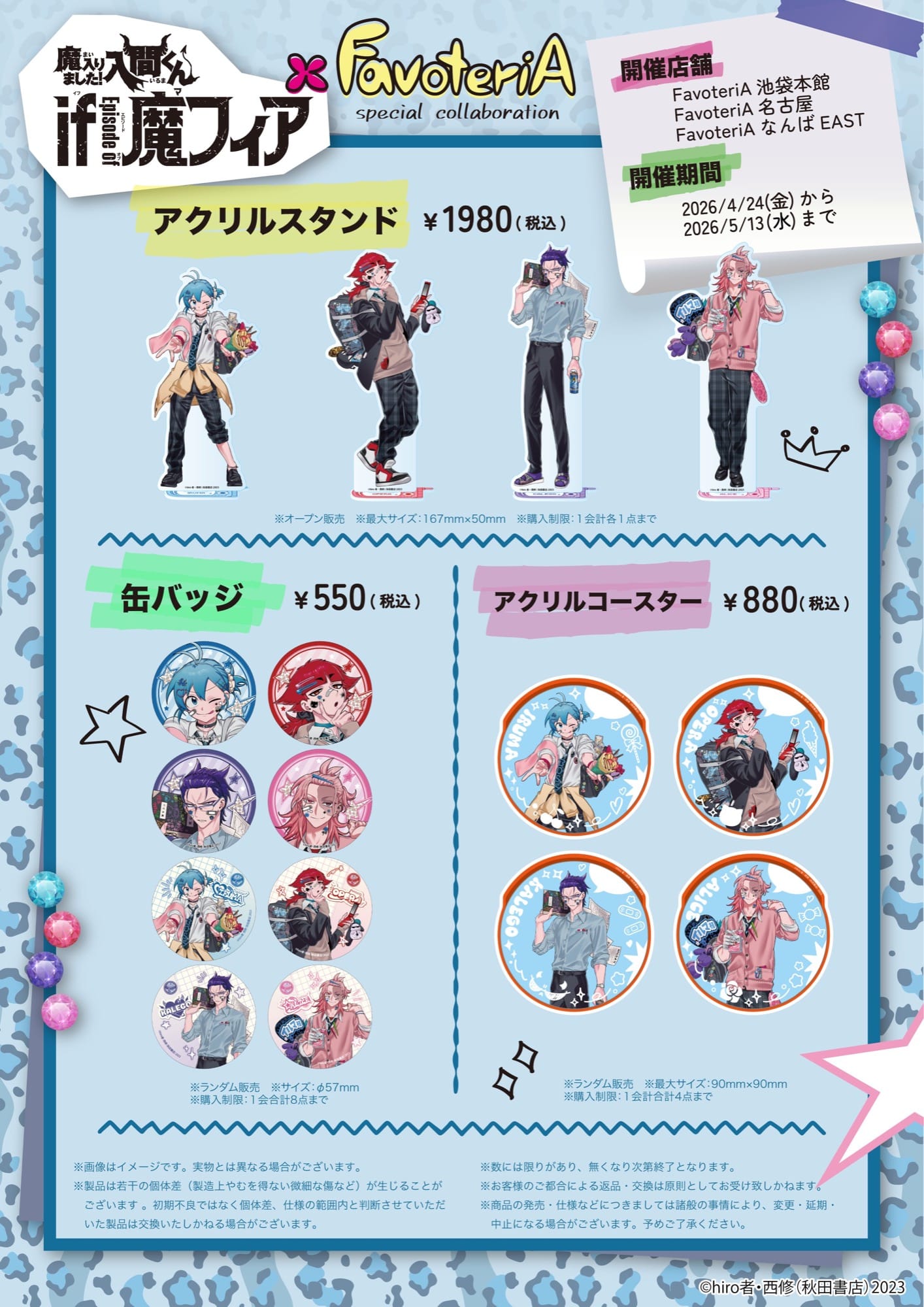 西修先生による人気漫画「魔入りました! 入間くん」を原作としたスピンオフ「魔入りました!入間くん if Episode of 魔フィア」× FavoteriA-ファボテリア- 3店舗 (池袋/名古屋/なんば) にて、2026年4月24日〜5月13日までコラボが開催される。