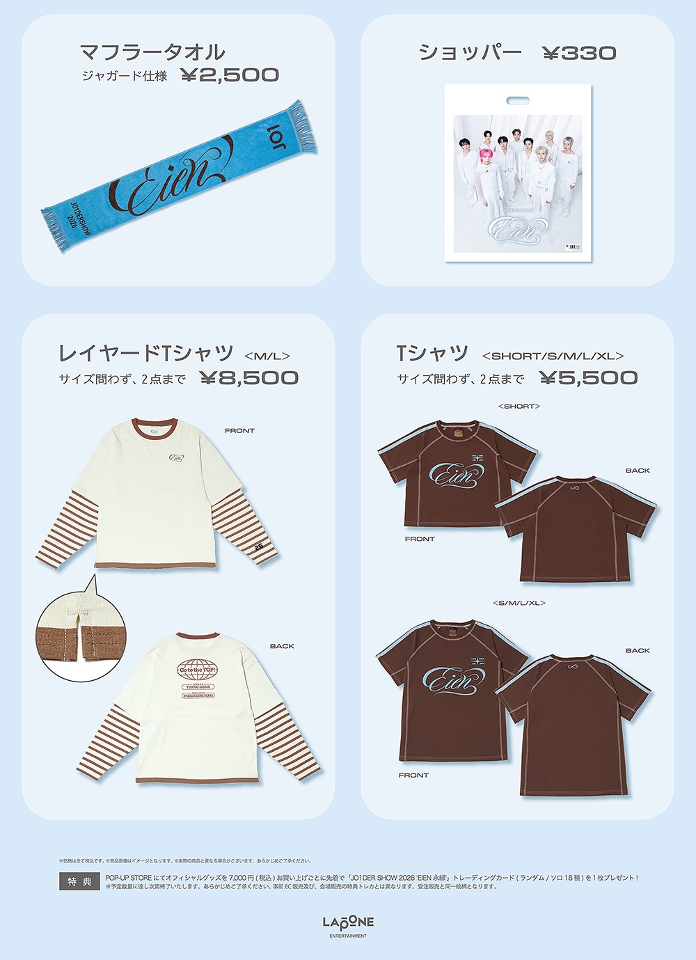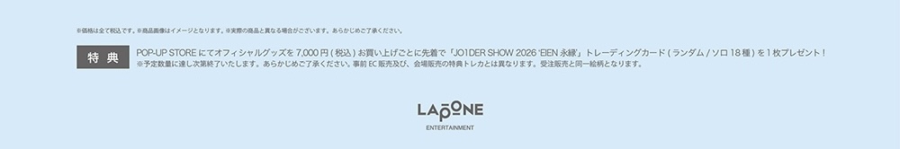 「JO1 (ジェイオーワン)」ポップアップストアにて、グッズをお買い上げ7,000円(税込)毎に特典として「JO1DER SHOW 2026‘EIEN 永縁’ トレーディングカード 全18種」がランダムに1枚プレゼントされる。