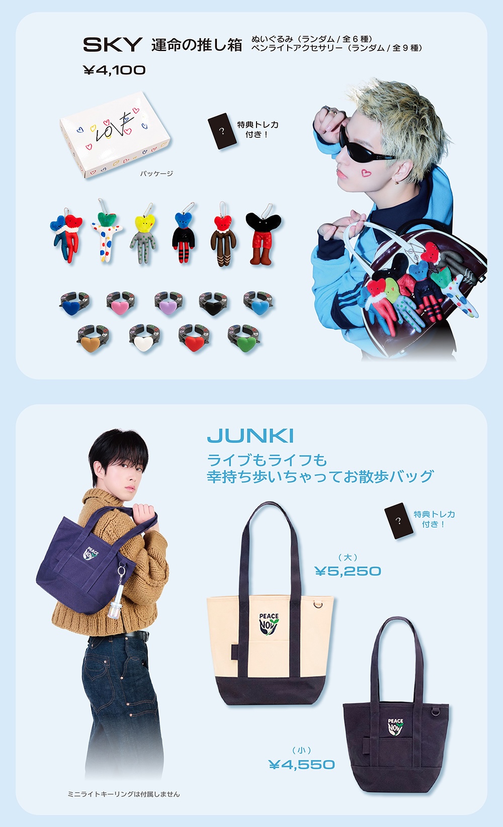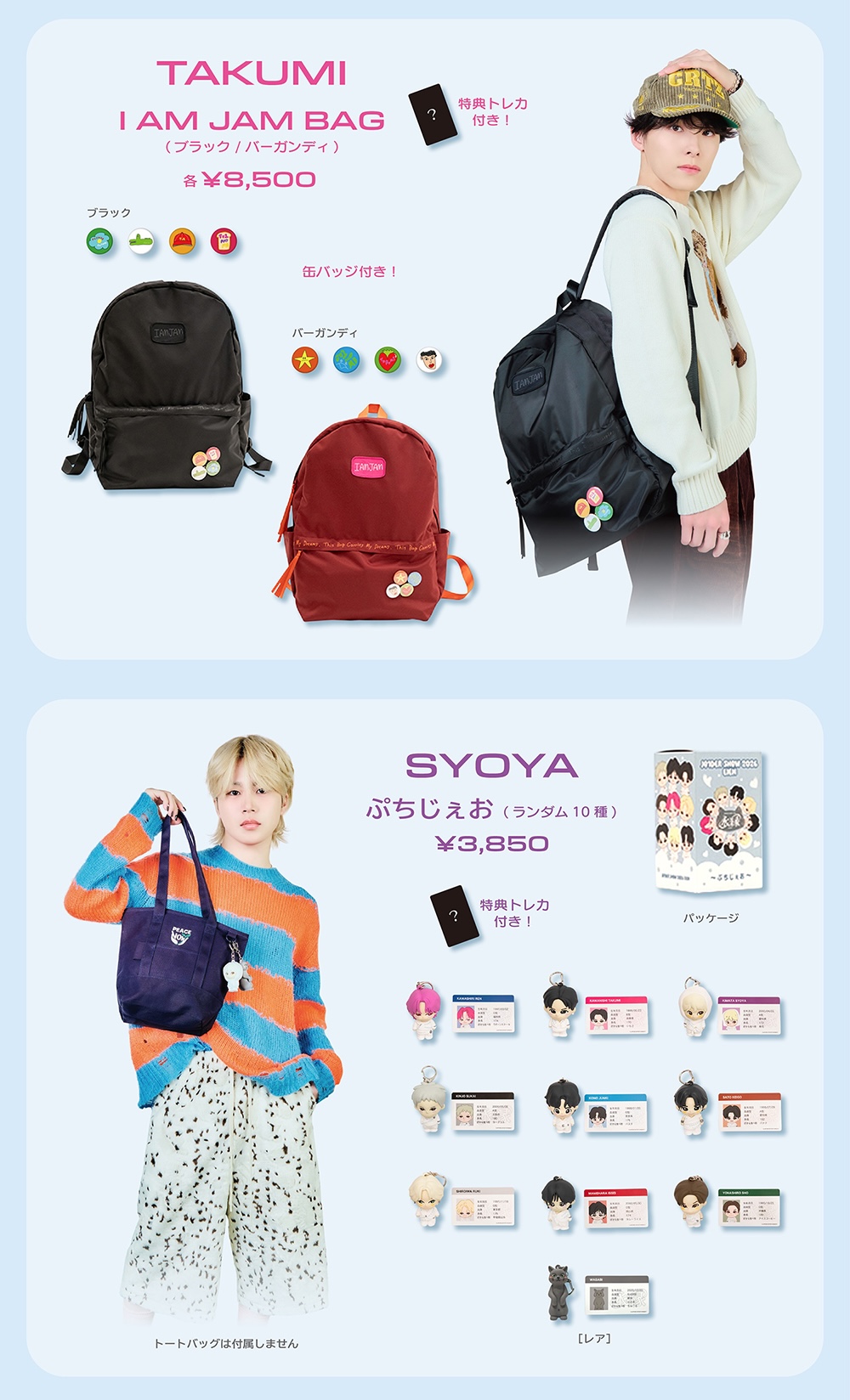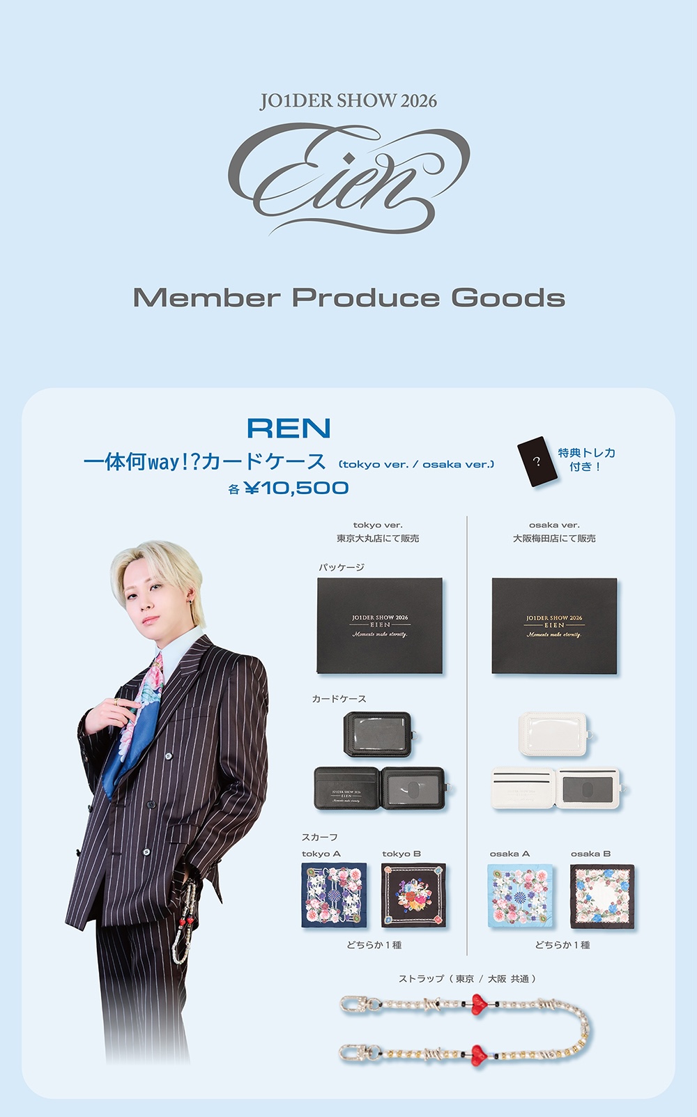 「BIGうちわ」「アクリルスタンド」のほか、特典トレカ付き「REN 一体何way!?カードケース」「SYOYA ぷちじぇお」などがラインナップする。