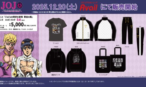 荒木飛呂彦先生による人気漫画を原作としたアニメ「ジョジョの奇妙な冒険 黄金の風」× しまむらグループが展開するカジュアルブランド「Avail (アベイル)」全国にて、2025年12月20日よりハッピーバッグが発売される。