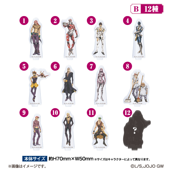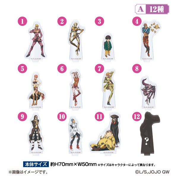 第5弾では、『ジョジョの奇妙な冒険 黄金の風』よりA12種、B12種の計24種のアクリルスタンドがラインナップ!