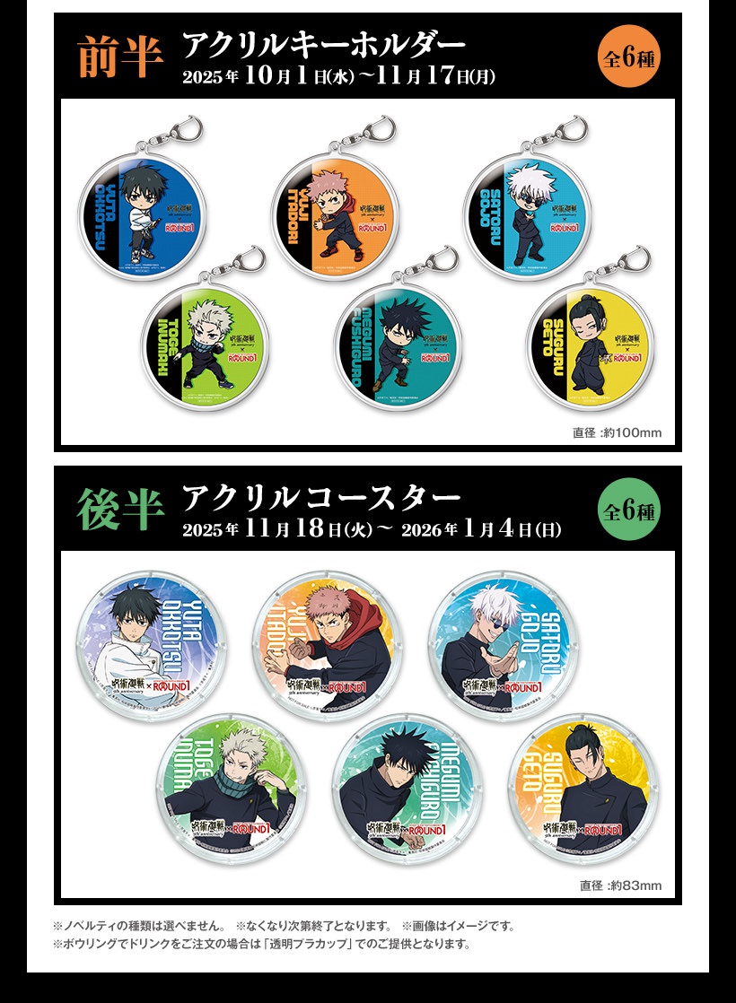 また、コラボメニューを注文すると特典として「アクリルキーホルダー (全6種)」「アクリルコースター (全6種)」を期間に応じてプレゼント!