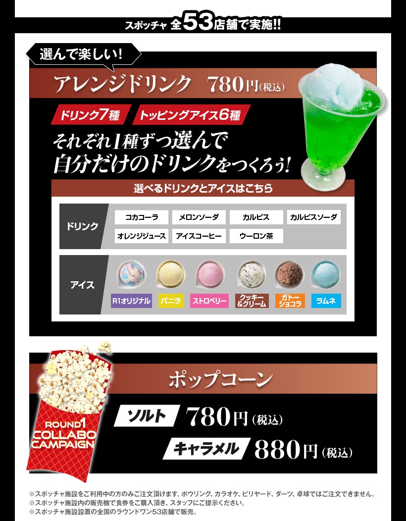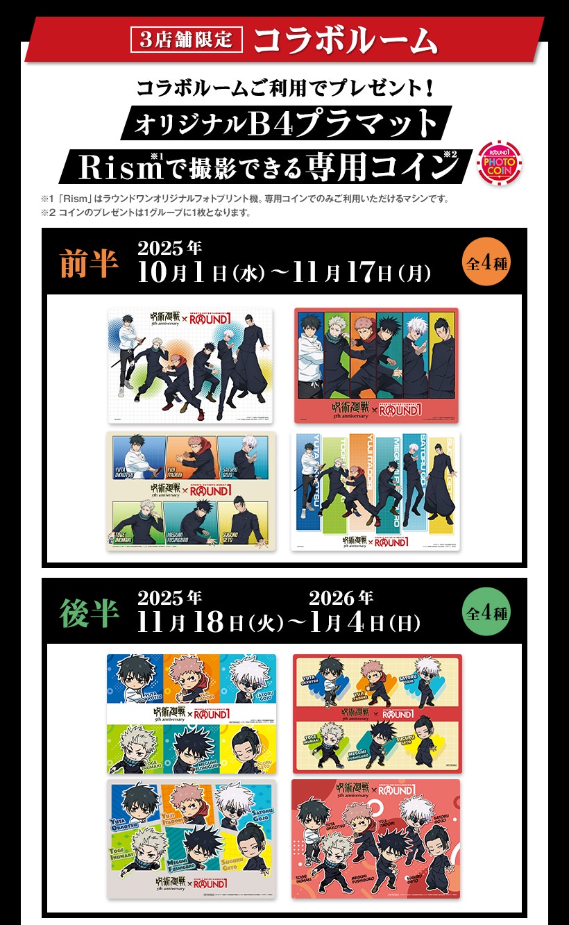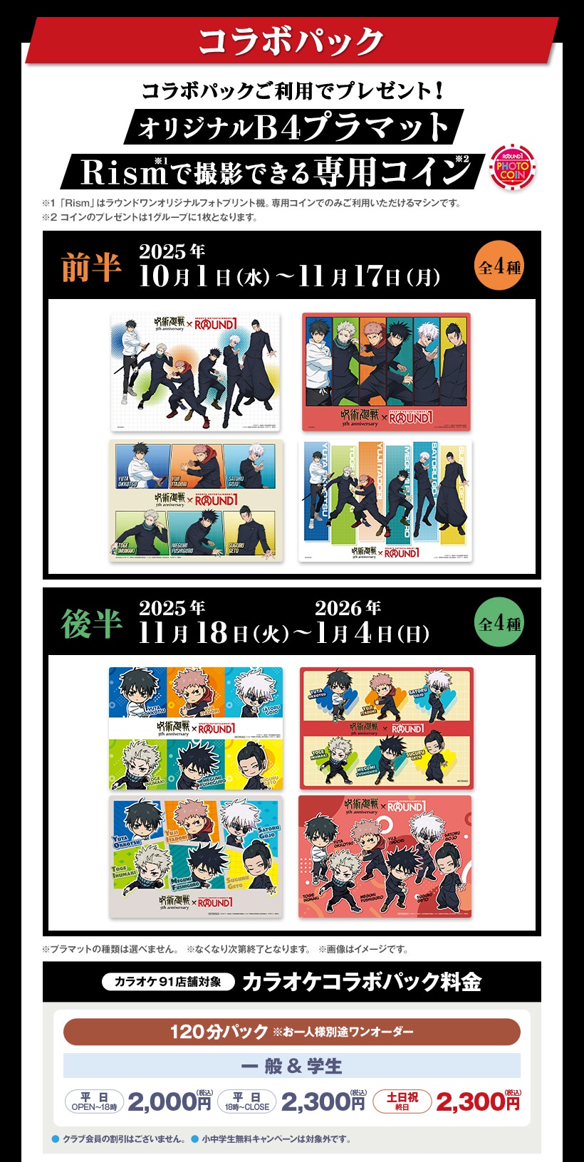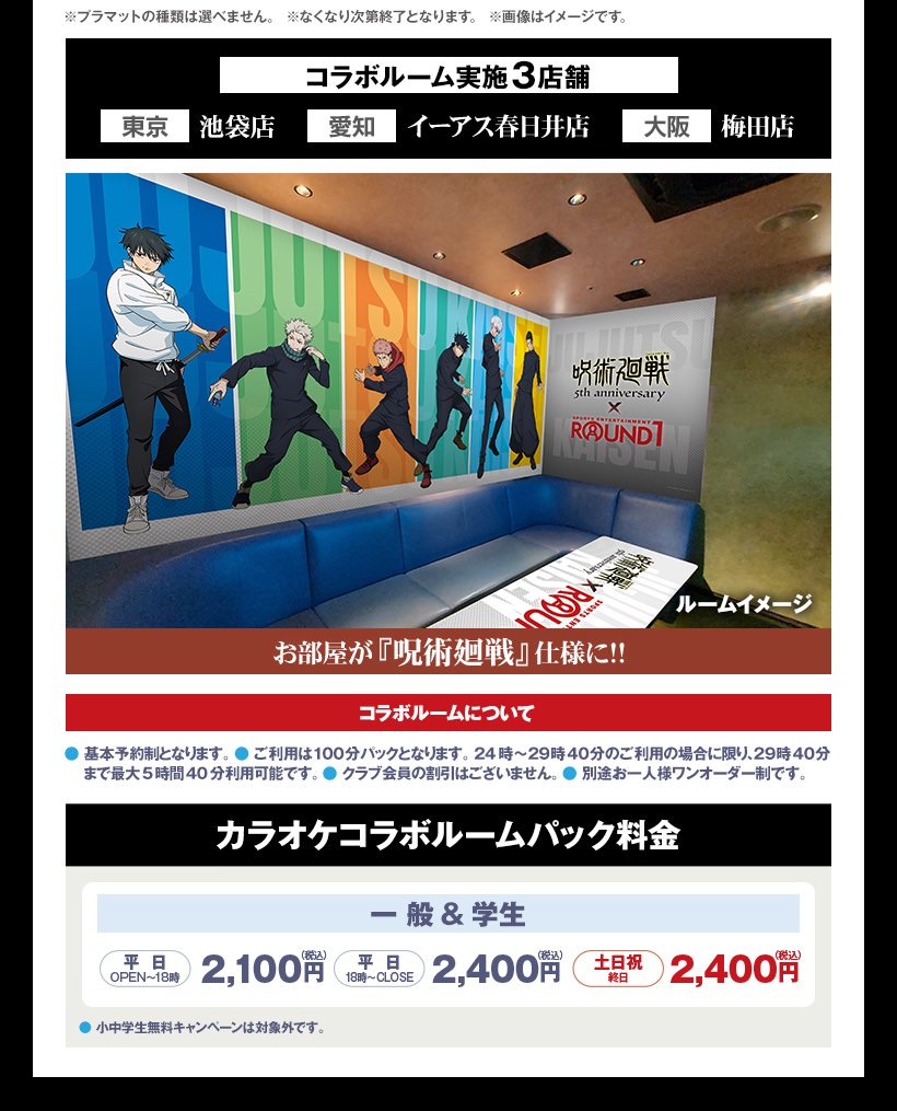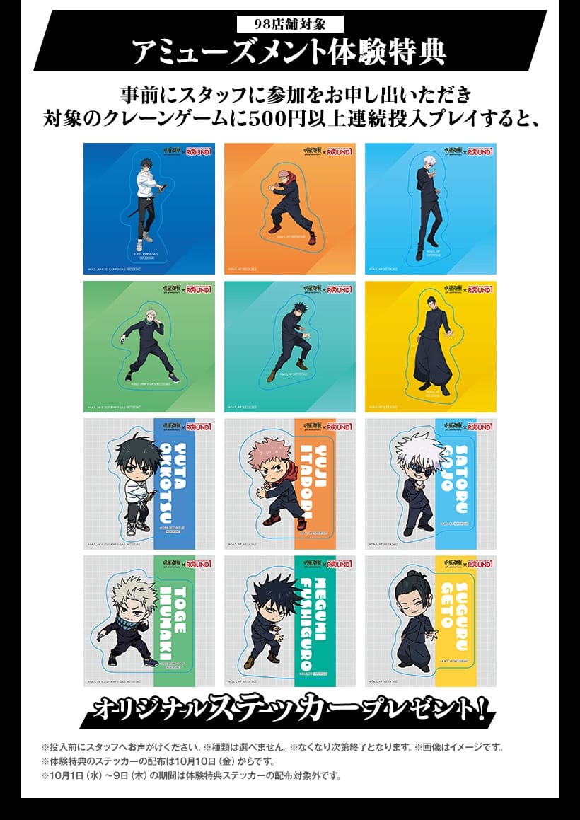 呪術師達をイメージしたオリジナルノベルティー付きのコラボメニューや、アミューズメントコーナー限定のオリジナルプライズグッズが展開されるほか、ROUND1内のカラオケ・ダーツ・ビリヤード・スポッチャでも特典配布やコラボルームなどのコラボが実施される。