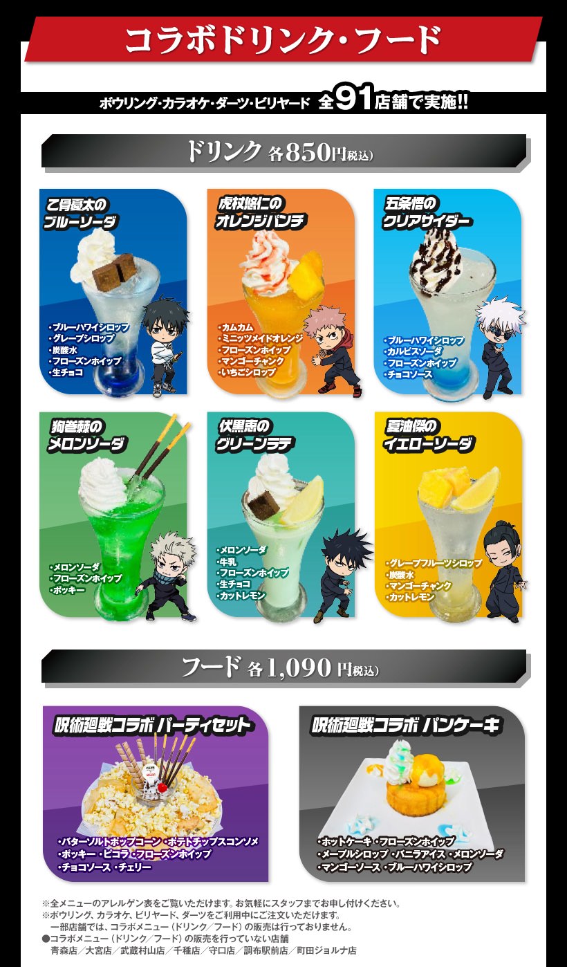 2025年10月1日よりラウンドワンにて開催される「呪術廻戦」コラボでは、ボウリング・カラオケ・ダーツ・ビリヤード全91店舗にコラボドリンク・フードが登場!