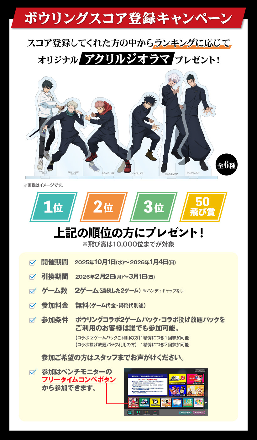 芥見下々先生による人気漫画を原作としたアニメ「呪術廻戦」× ROUND1 (ラウンドワン)によるコラボキャンペーンが、2025年10月1日〜2026年1月4日までの期間限定で開催される。