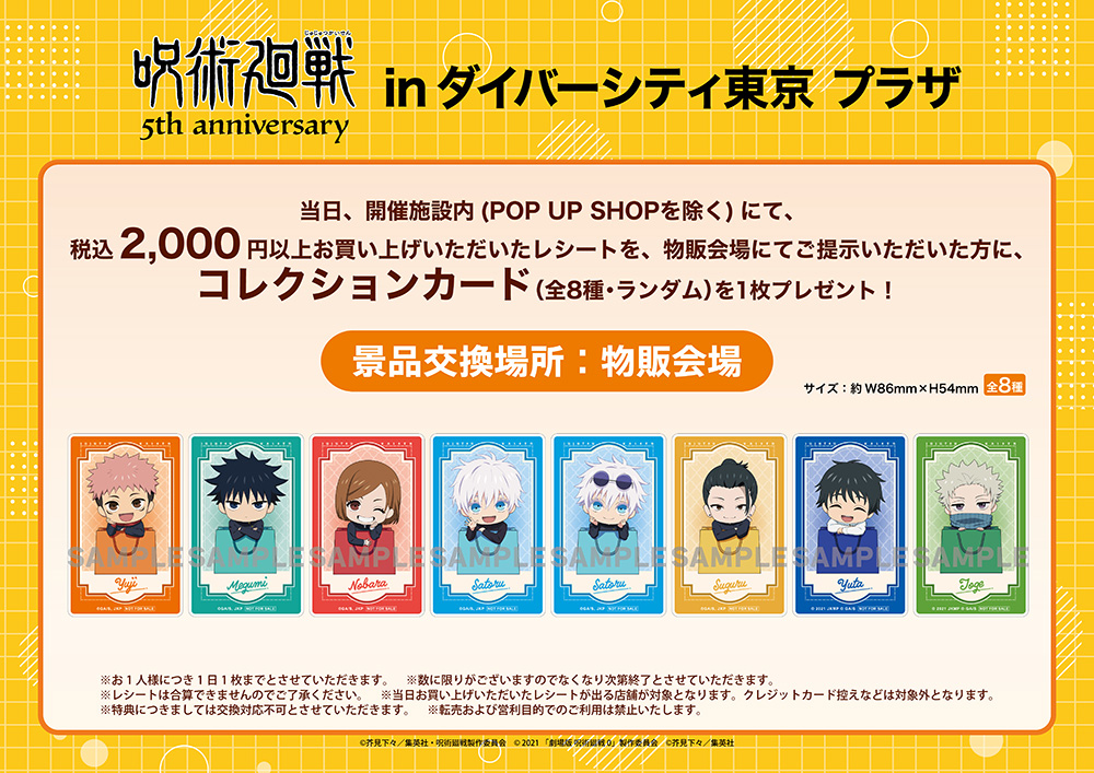 開催期間中に「アニメ『呪術廻戦』5周年 in ダイバーシティ東京 プラザ」グッズを2,000円(税込)以上購入するごとに特典として、「ブロマイド」を期間に応じたデザインの中からランダムに1枚プレゼント!