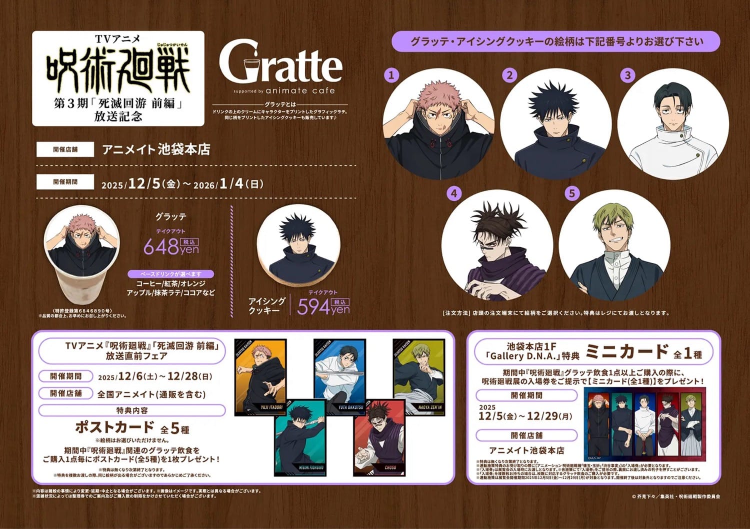 さらに、12月6日〜12月28日の期間中にグラッテ飲食を1点購入ごとに、全国のアニメイト (通販含む) にて開催される「TVアニメ『呪術廻戦 「死滅回遊 前編」』放送直前フェア」の特典「ポストカード 全5種」からランダムで1枚をプレゼント。