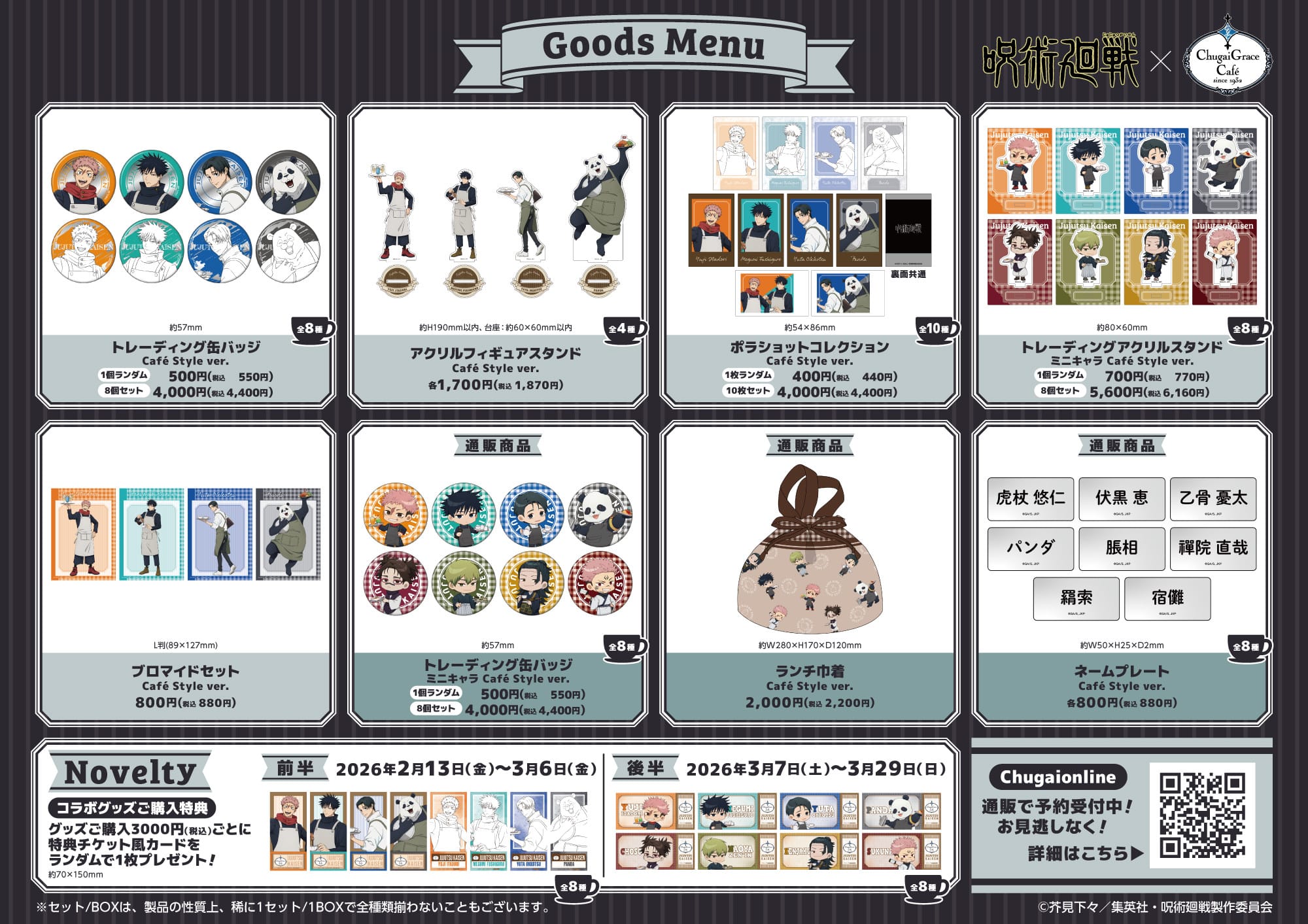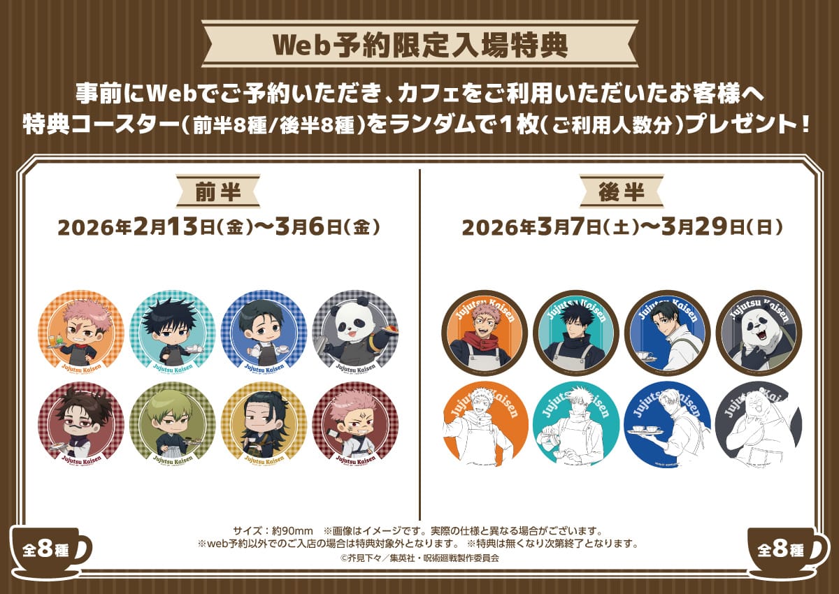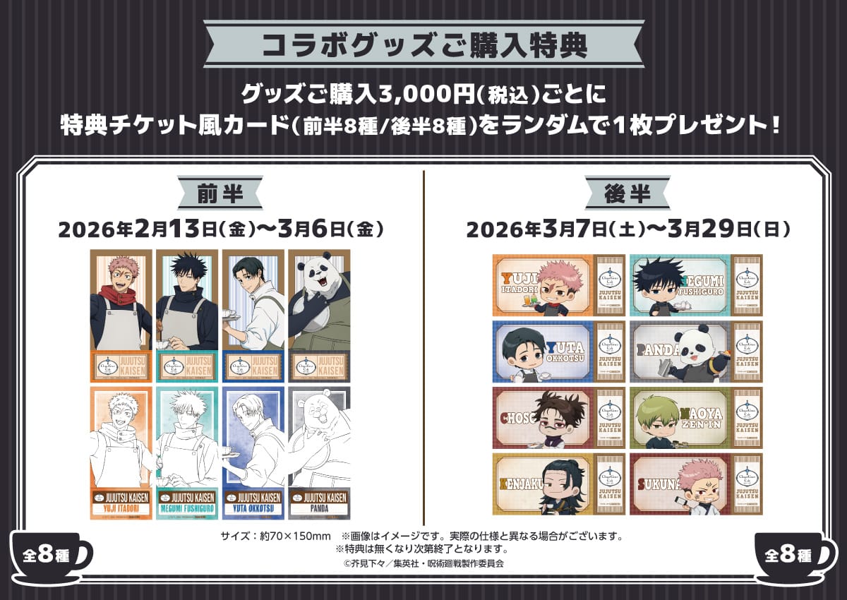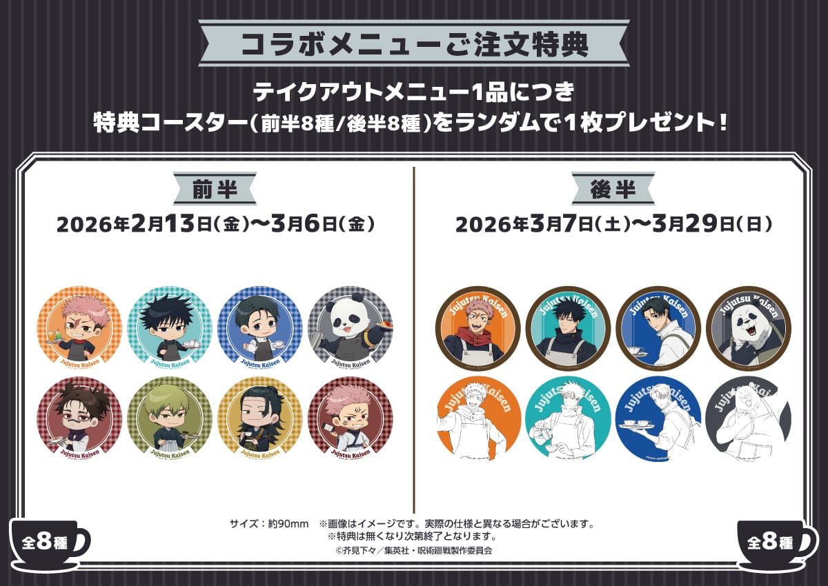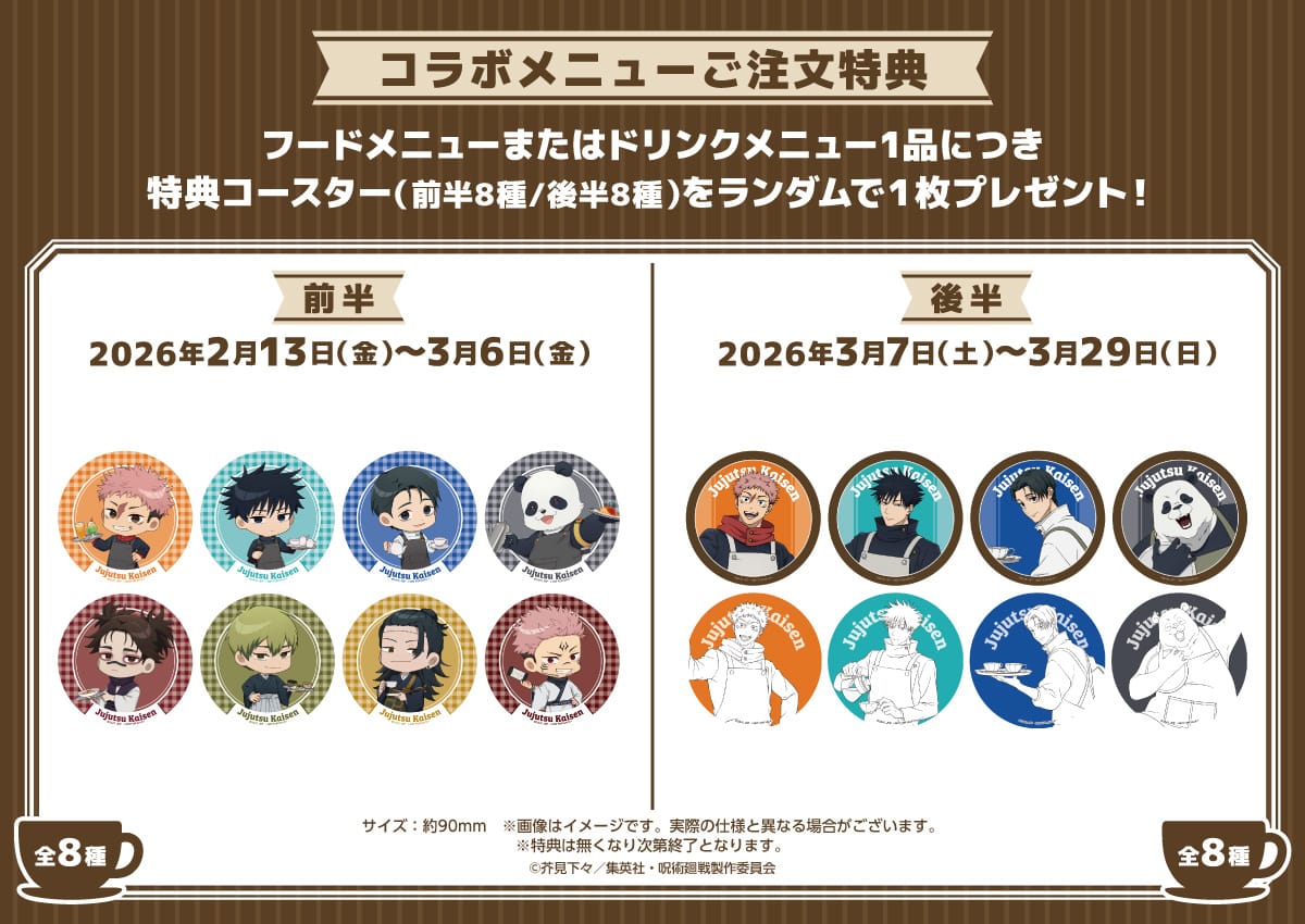 2026年2月13日〜3月29日までの期間開催される「呪術廻戦」コラボカフェでは、カフェスタッフとして働く虎杖悠仁・伏黒恵・乙骨憂太・パンダの描き下ろしイラストや、脹相・禪院直哉・夏油 (加茂憲倫) ・両面宿儺も含めたミニキャライラストを使用した、グッズが登場!
