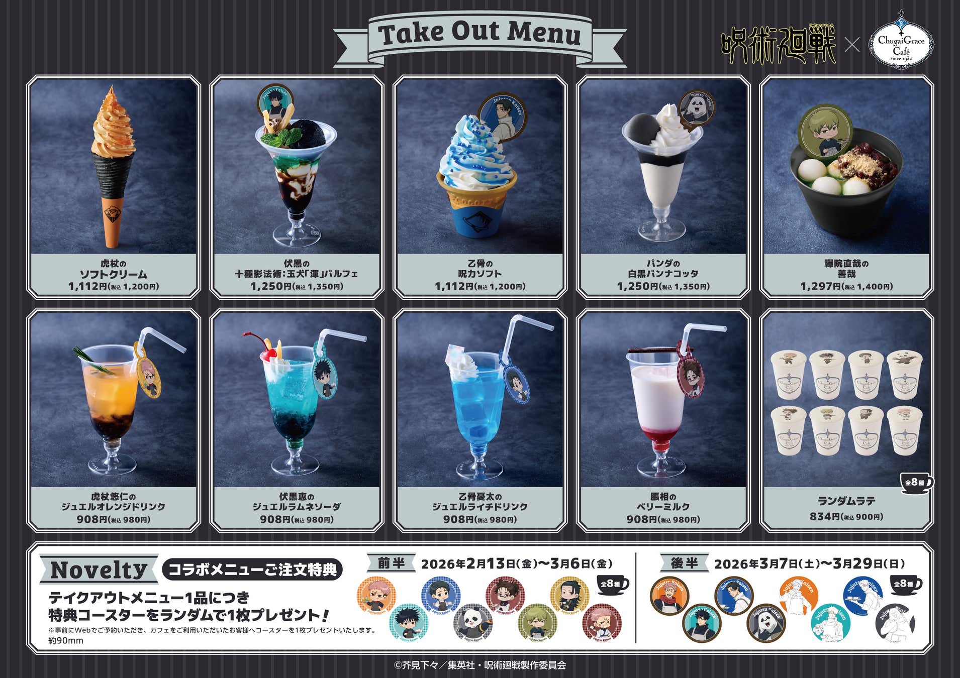 芥見下々先生による人気漫画を原作としたアニメ「呪術廻戦」× Chugai Grace Cafe東京・大阪にて、2026年2月13日〜3月29日までコラボカフェが開催される。 (※大阪店はテイクアウトのみの営業)