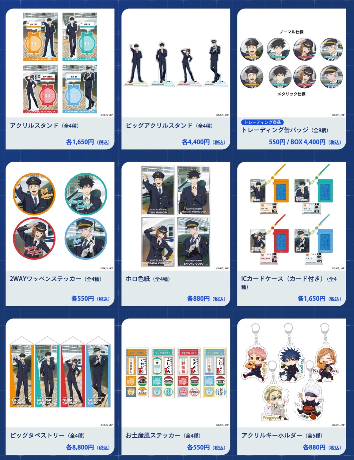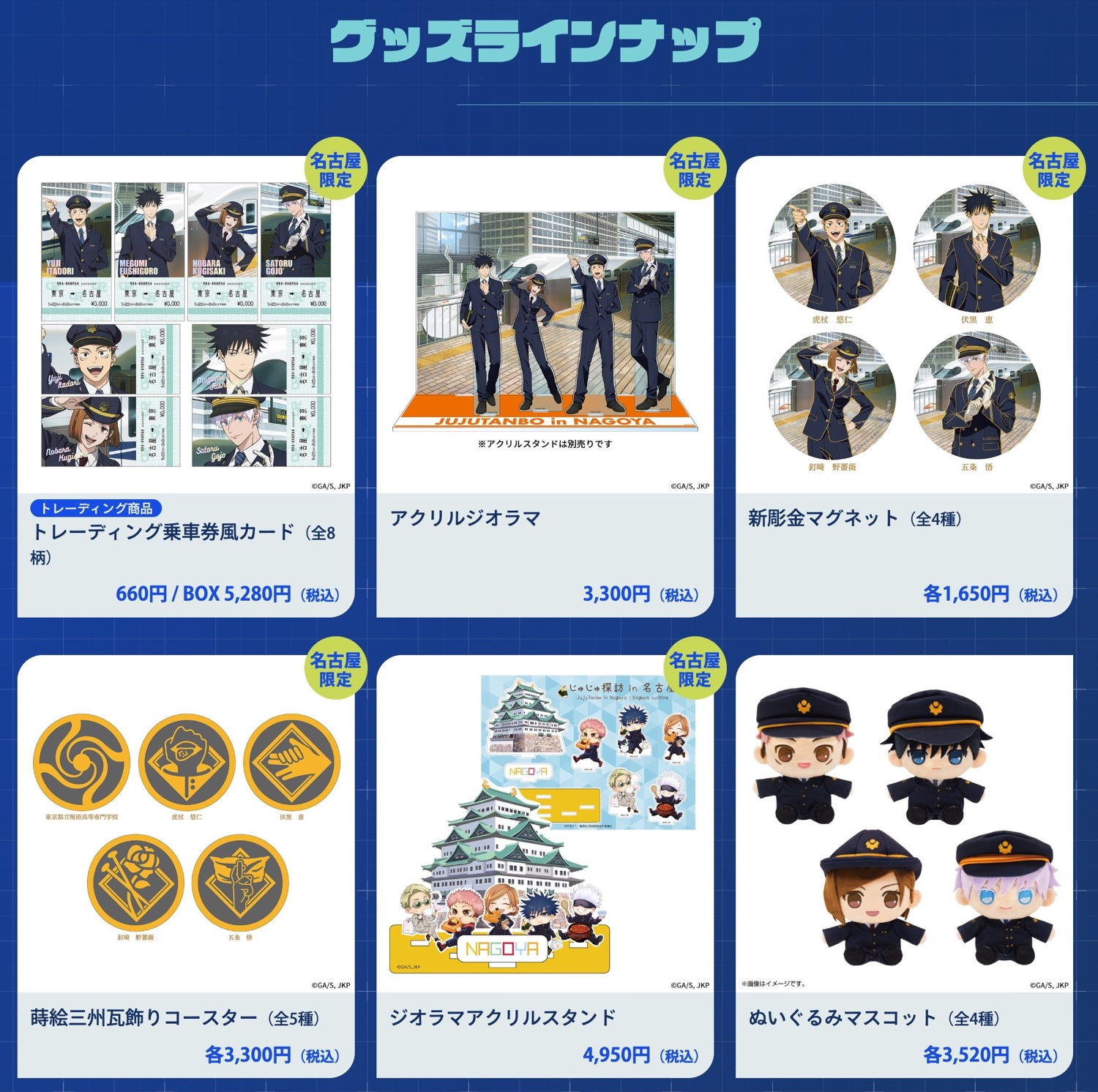コラボグッズとして虎杖悠仁・伏黒恵・釘崎野薔薇・五条悟らが駅員の制服に身を包む描き下ろしイラストを使用した「アクリルジオラマ」や「新彫金マグネット」「ぬいぐるみマスコット」などがラインナップ!