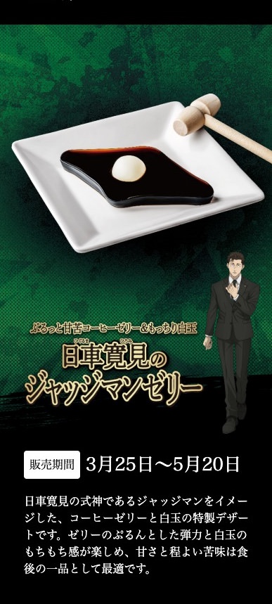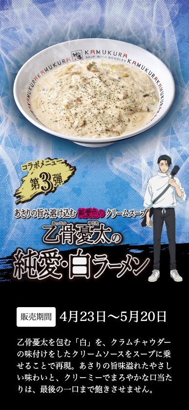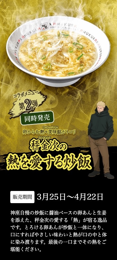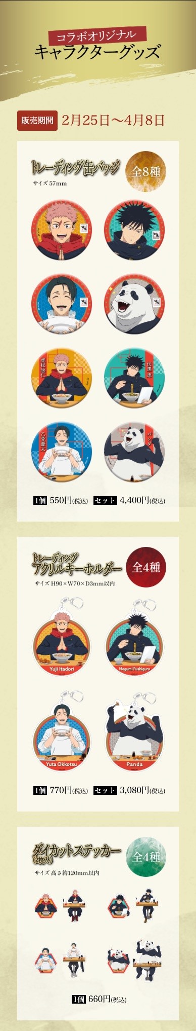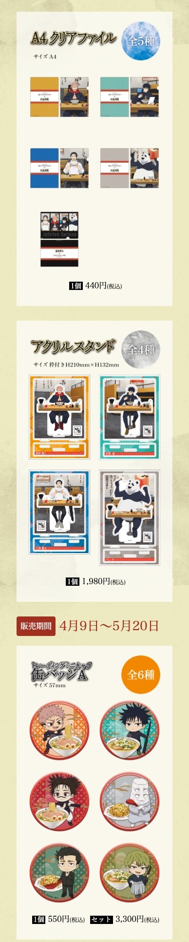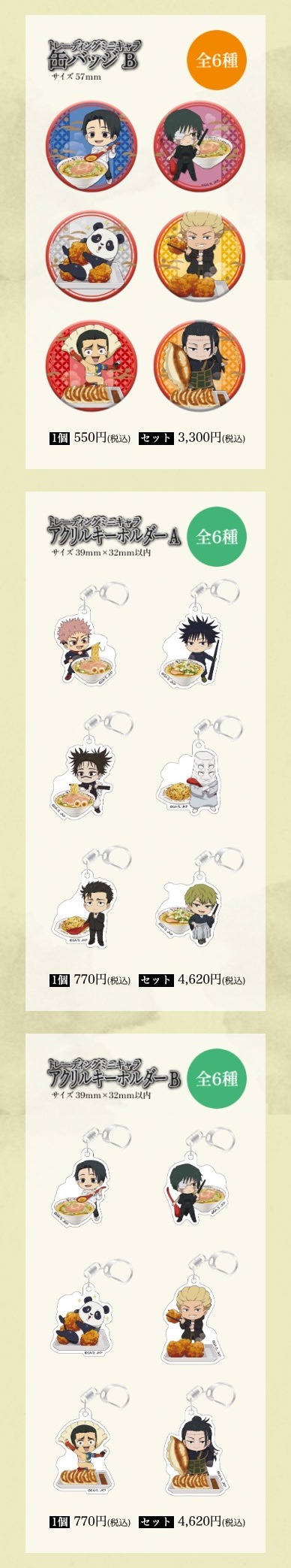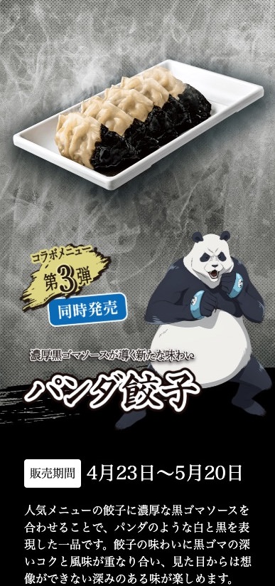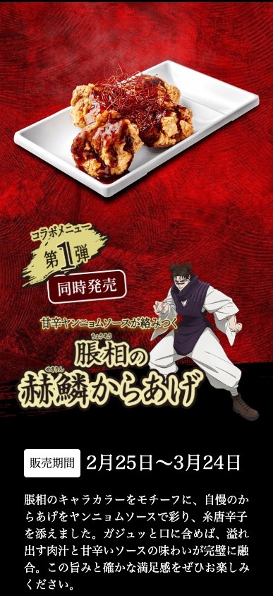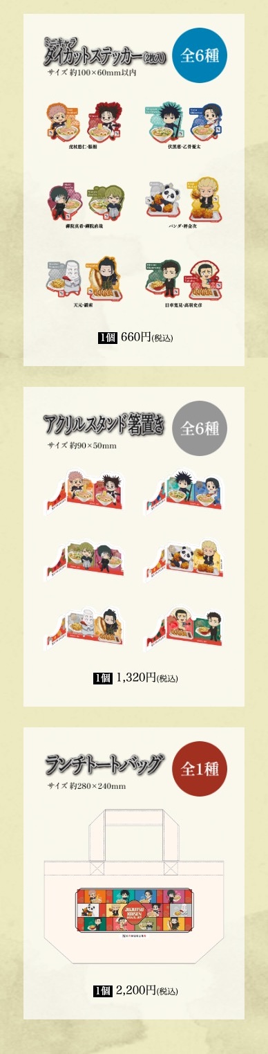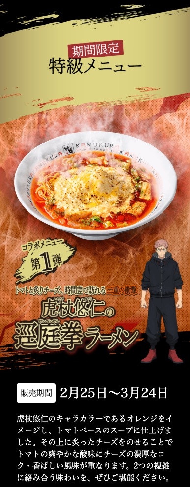 2026年2月25日〜3月24日までの期間は第1弾として「虎杖悠仁(いたどりゆうじ)の逕庭拳(けいていけん)ラーメン」や「甘辛ヤンニョムソースが絡みつく脹相の赤鱗からあげ」が、3月25日〜4月22日までの期間は第2弾として「伏黒恵の獣合暗影担々麺」と「秤金次の熱を愛する炒飯」が、4月23日~5月20日 までの期間は第3弾として「乙骨憂太の純愛・白ラーメン」と「パンダ餃子」がラインナップする。