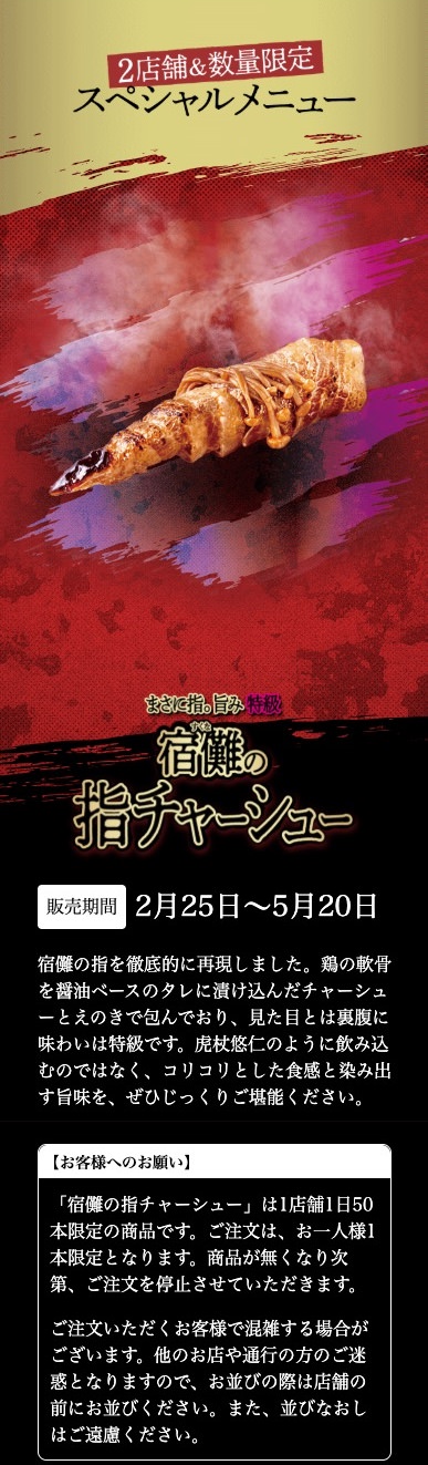 さらに、どうとんぼり神座 御堂筋店・どうとんぼり神座 アトレ恵比寿店ではスペシャルメニュー「宿儺(すくな)の指チャーシュー」も!
