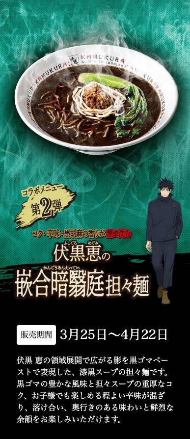 伏黒恵の術式「十種影法術」を表現した漆黒のピリ辛な黒胡麻担々麺。