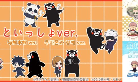 描き起こしイラストには、“くまモンといっしょver.”イラストと“飛行機ver.”イラストには、虎杖悠仁・伏黒恵・釘崎野薔薇・禪院真希・狗巻棘・パンダ・五条悟ら7キャラクター、日本の文化や土地を楽しむ様子を描いた“Enjoy Japan ver.”イラストには、七海建人が加わった8キャラクターが登場する。