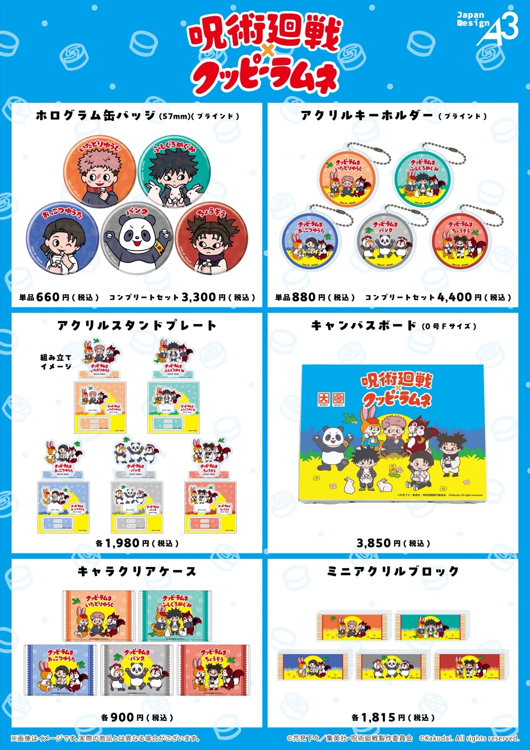「呪術廻戦&クッピーラムネ」ポップアップストアでは、虎杖悠仁・伏黒恵・乙骨憂太・パンダ・脹相・クッピー・ラムたちが、ラムネを食べているコラボビジュアルを使用したグッズが多数販売!