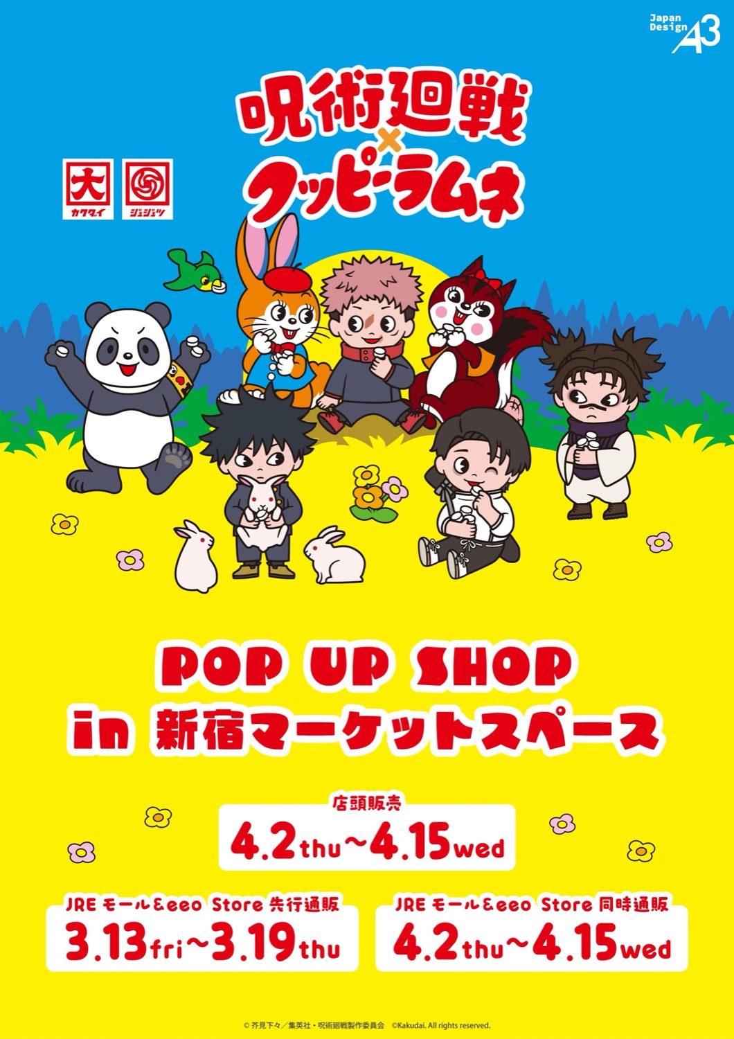 芥見下々先生による人気漫画を原作としたアニメ「呪術廻戦」× カクダイ製菓株式会社による長年愛される人気お菓子「クッピーラムネ」のポップアップストアが、JR新宿駅中央東口改札外 新宿マーケットスペースにて2026年4月2日〜4月15日まで開催される。