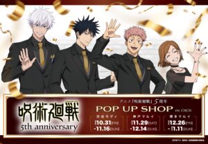 「芥見下々」先生による大人気漫画を原作とするTVアニメ「呪術廻戦」の5周年を記念したポップアップストアが、東京・兵庫・福岡にて、2025年10月31日〜2026年1月11日まで開催!虎杖悠仁・伏黒恵・釘崎野薔薇・五条悟たちが5周年をお祝いする正装に身を包んだ描き下ろしイラストのオリジナルグッズが登場!