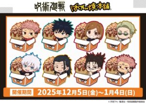 芥見下々先生による人気漫画を原作としたアニメ「呪術廻戦」× ばくだん焼本舗5店舗 (池袋本店 (東京)/東京ドームシティ店/盛岡渋民イオン店 (岩手)/大分湯布院店/OCTOPUS HOLD (長野)) にて、2025年12月5日〜2026年1月4日までコラボキャンペーンが開催される。