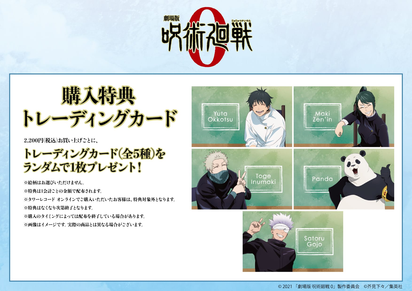 さらに、『劇場版 呪術廻戦 0』POP UP SHOP in TOWER RECORDSにて商品を2,200円(税込)お買い上げごとに、先着で特典トレーディングカード(全5種)をランダムで1枚プレゼント!