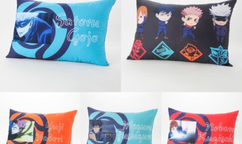 しまむらオンラインにて発売される「呪術廻戦」の枕は、アニメ絵柄を使用した虎杖悠仁・伏黒恵・釘崎野薔薇・五条悟・4人集合の全5種がラインナップ!