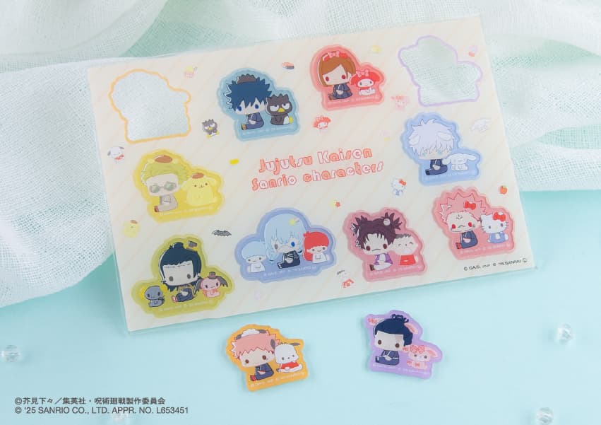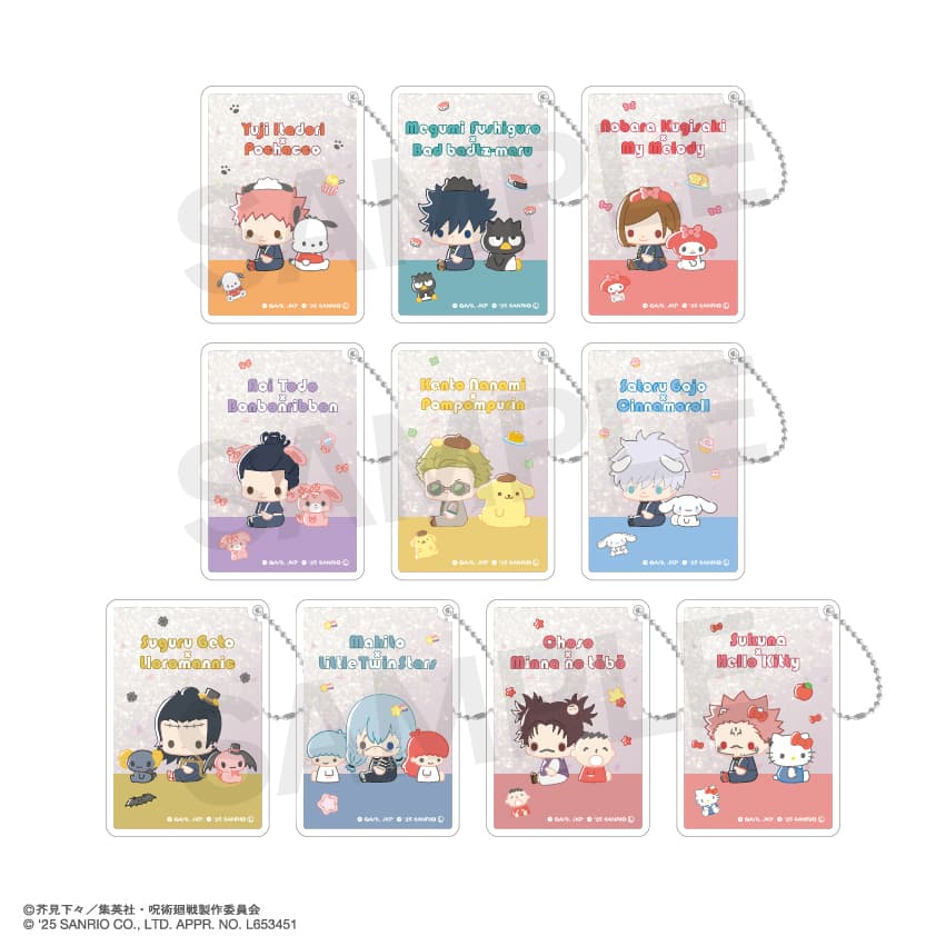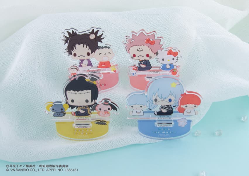 虎杖 悠仁・ポチャッコ / 伏黒 恵・バッドばつ丸 / 釘崎 野薔薇・マイメロディ / 東堂 葵・ぼんぼんりぼん / 七海 建人・ポムポムプリン / 五条 悟・シナモロール / 夏油 傑・ルロロマニック / 真人・リトルツインスターズ / 脹相・みんなのたあ坊 / 宿儺・ハローキティ