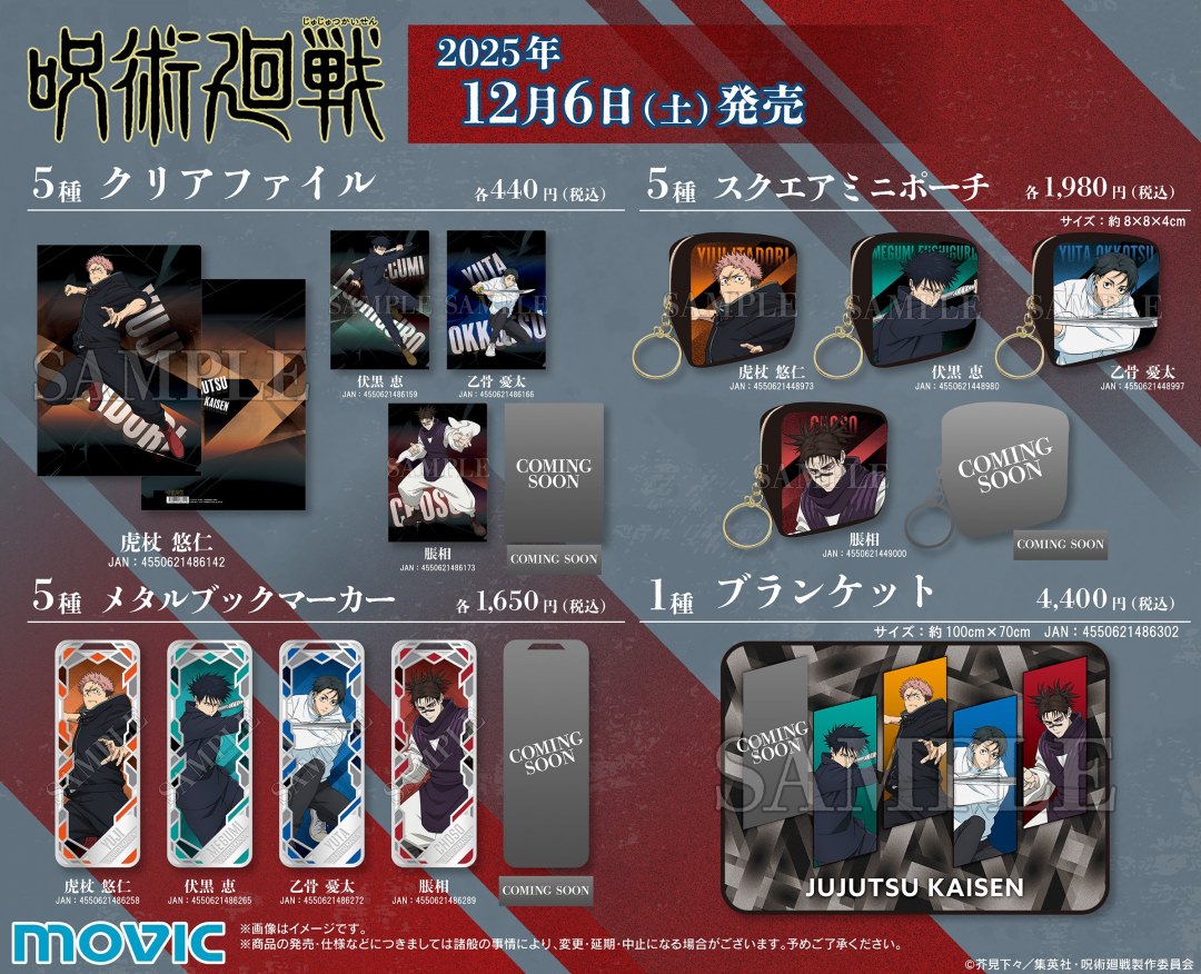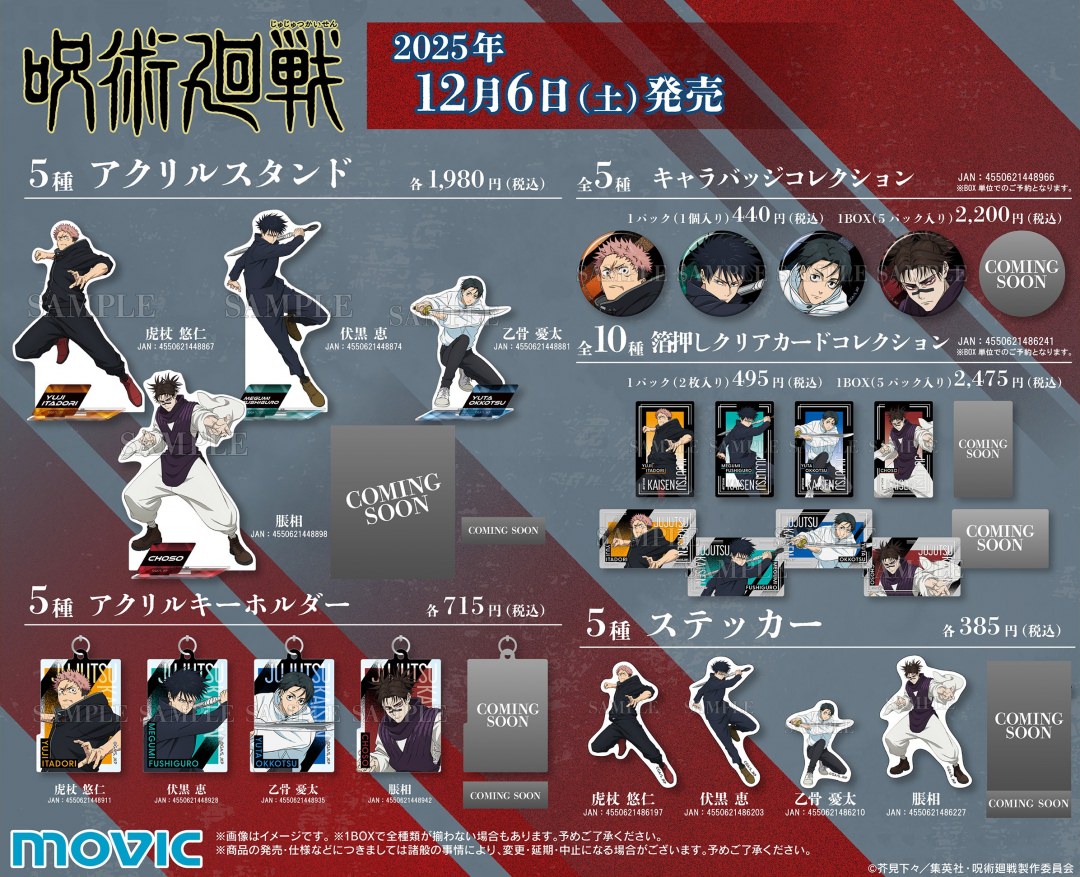 2025年12月6日より開催される『「死滅回游 前編」放送直前フェア』では、虎杖悠仁・伏黒恵・乙骨憂太・脹相たちの新規ビジュアルを使用したグッズが登場!