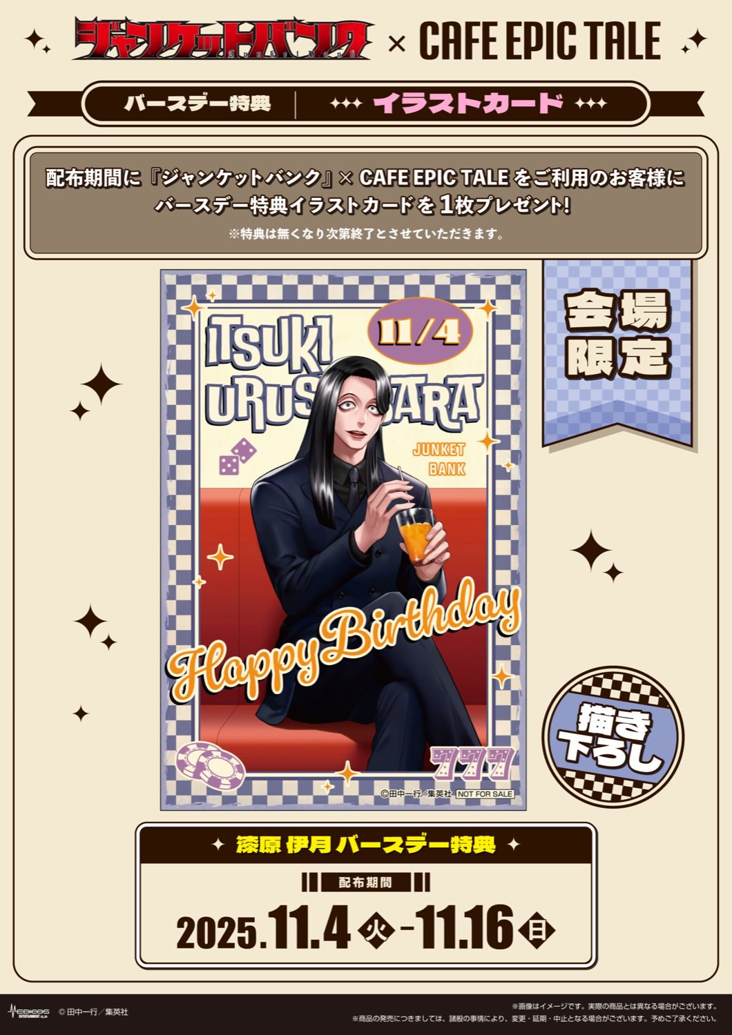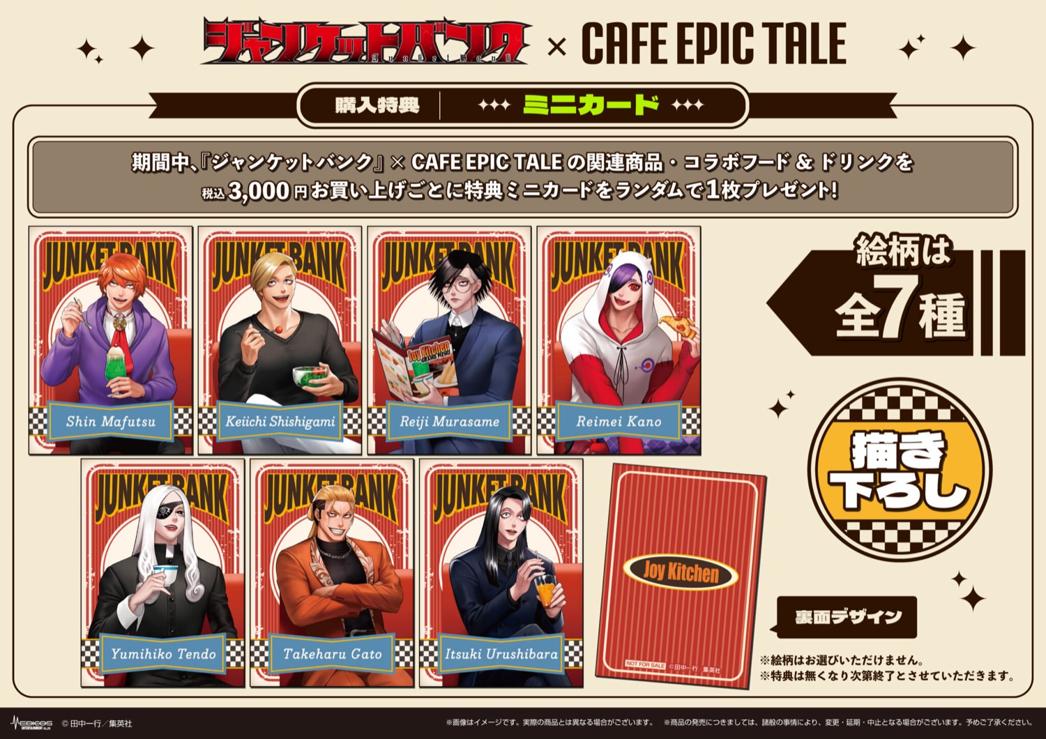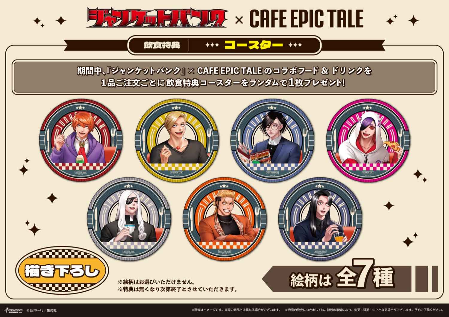 「ジャンケットバンク × CAFE EPIC TALE 大阪」コラボにて、『ジャンケットバンク』コラボメニューを1品ご注文ごとに特典コースター(全7種)をランダムで1枚、関連商品(コラボメニューを含む)を3,000円(税込)お買い上げごとに特典ミニカード(全7種)をランダムで1枚プレゼント!