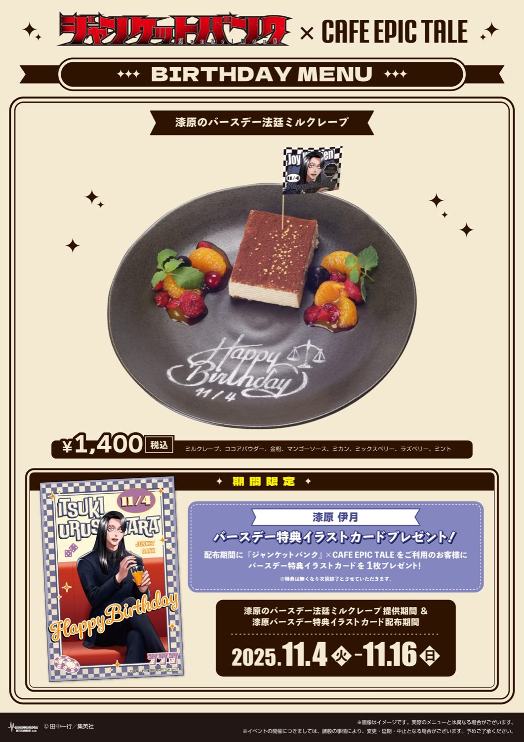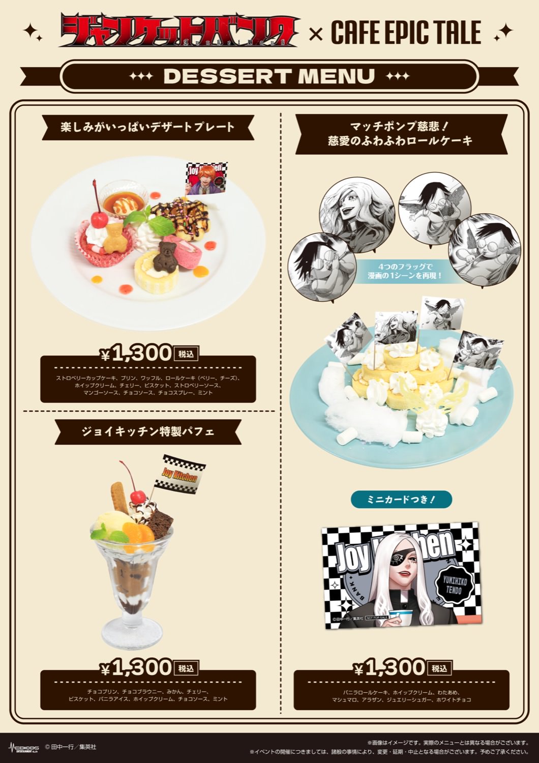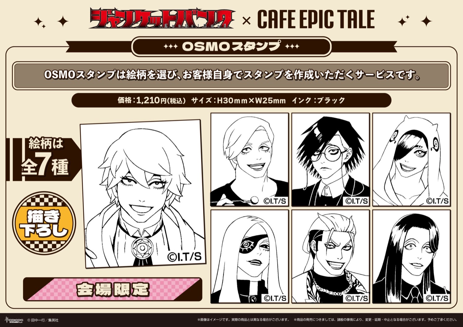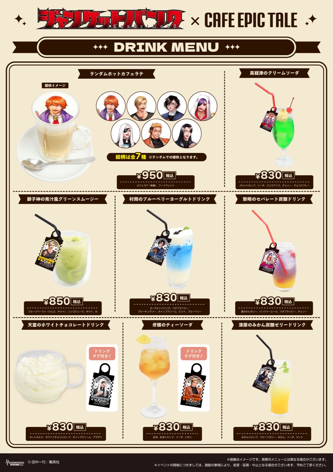 「ジャンケットバンク × CAFE EPIC TALE 大阪」コラボにて、『ジャンケットバンク』コラボメニューを1品ご注文ごとに特典コースター(全7種)をランダムで1枚、関連商品(コラボメニューを含む)を3,000円(税込)お買い上げごとに特典ミニカード(全7種)をランダムで1枚プレゼント!