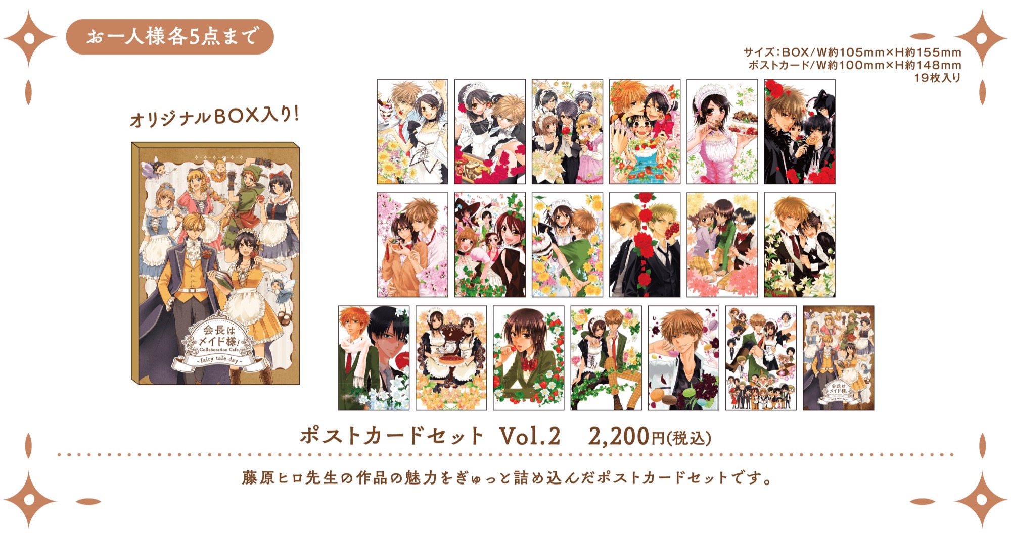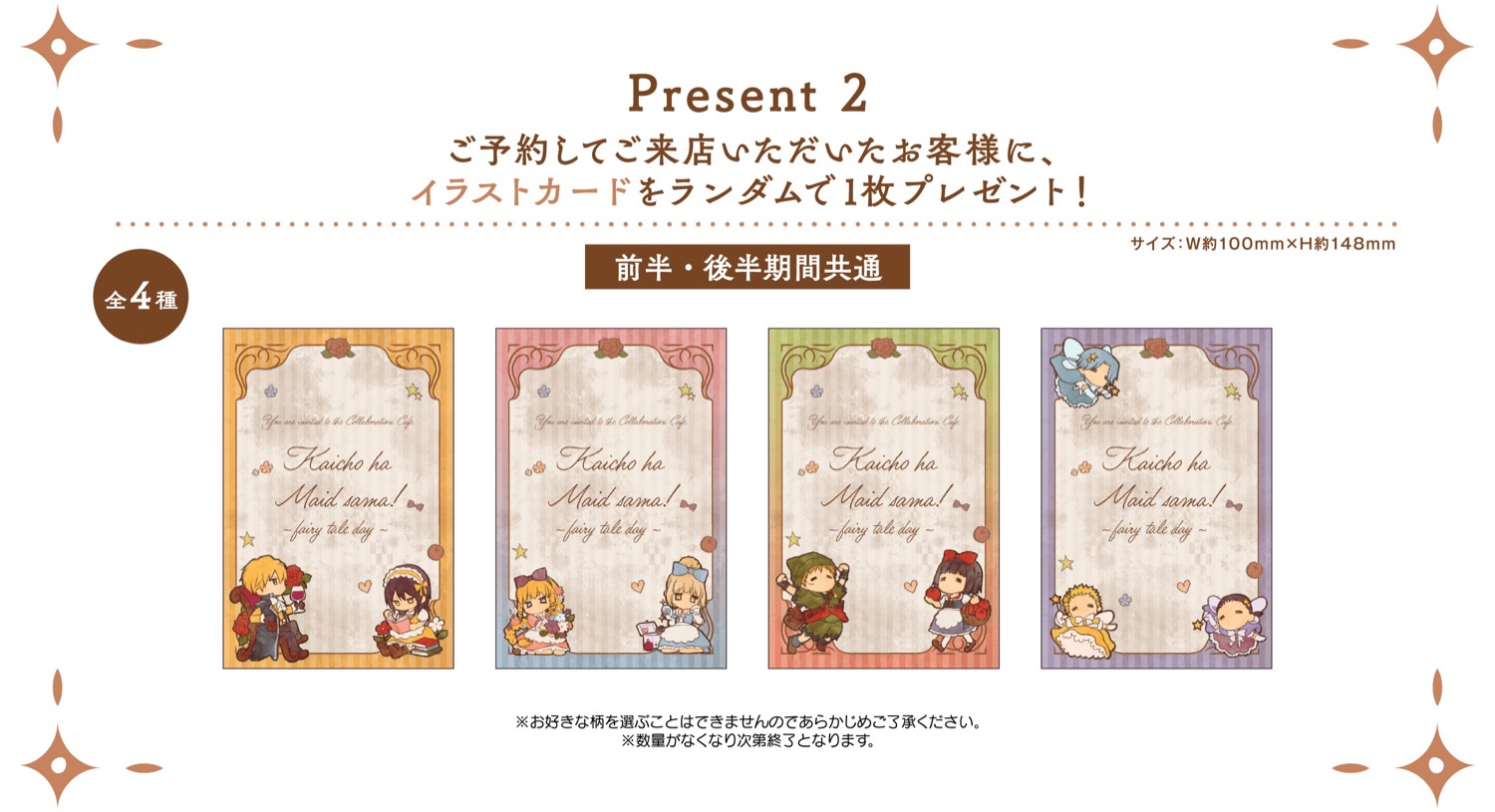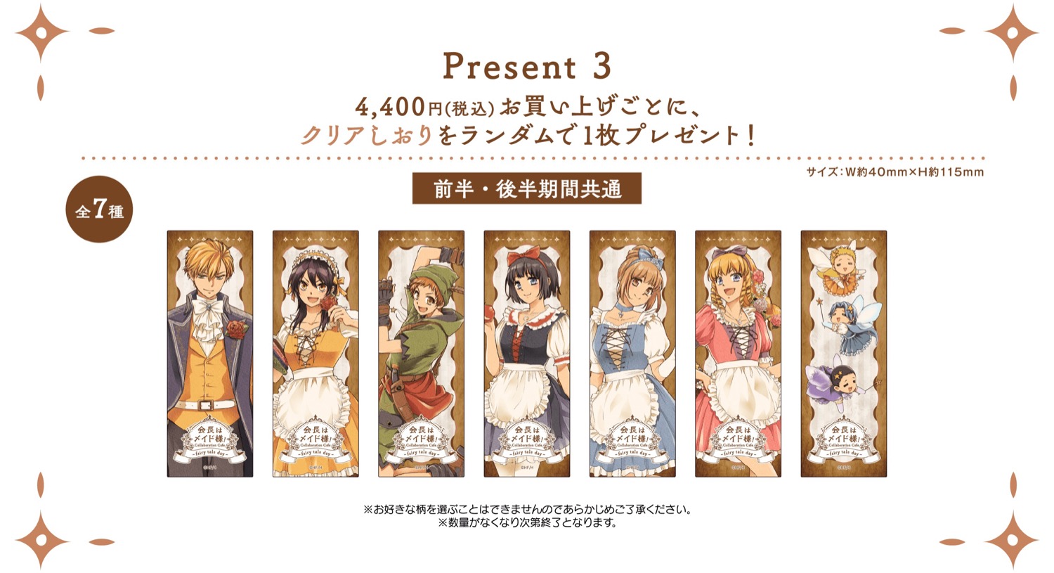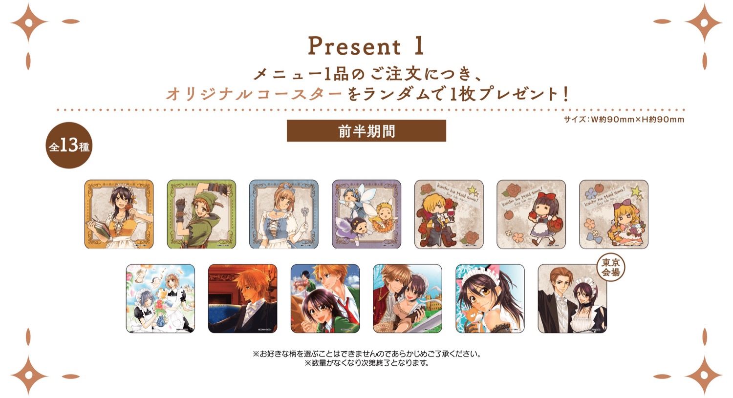 「会長はメイド様! × My Charaful Cafe」コラボにて、コラボメニューを1品注文ごとに特典として、描き下ろしイラストを使用した「コースター (前期:13種)」をランダムに1枚、予約の上来場すると「イラストカード (全4種)」をランダムに1枚プレゼント!