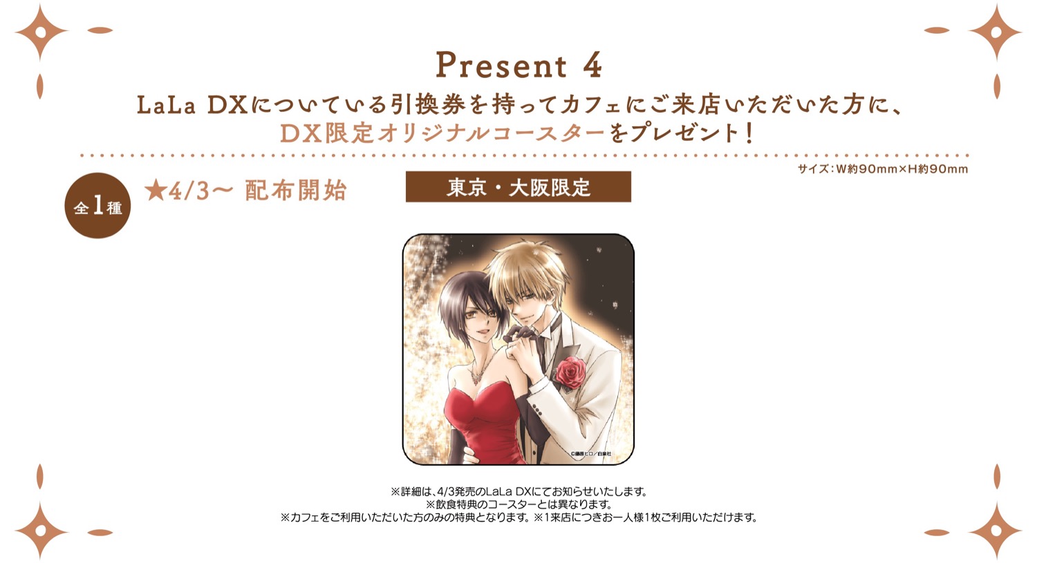 さらに、会場にて4,400円(税込)購入するごとに「クリアしおり (全7種)」がランダムに1枚プレゼントされるほか、LaLa DXについている引換券を持ってカフェに来場すると「DX限定オリジナルコースター」をプレゼント!