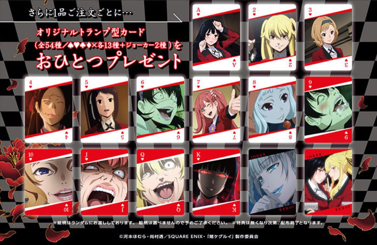 TVアニメ「賭ケグルイ」 × カラオケの鉄人とのコラボレーションが2017年9月15日〜11月5日の期間限定で開催されます!!トランプ風カードが貰えるコラボメニューや課題曲パックプランの販売が実施されます。課題曲で条件を満たせばノベルティーコンプリートセットのGETチャンスも!!コラボ開催店舗は、池袋東口店 / 池袋西口店 / 新宿歌舞伎町店 / 新宿大ガード店 / 渋谷道玄坂店 / 神田西口駅前店 / 町田店となっています。