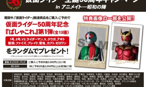 2021年5月1日から開催される「仮面ライダー生誕50周年キャンペーン in アニメイト全国」では、開催店舗にて期間中に「仮面ライダー」関連の書籍、キャラクターグッズをご購入・ご予約内金2,000円ごと、またはBD・DVDを1本ご予約(内金2,000円以上必須)毎に、「1号」、「2号」、「V3」、「ライダーマン」、「X」、「クウガ」、「アギト」、「龍騎」、「ファイズ」、「ブレイド」、「響鬼」、「カブト」、「ゼロワン」の「ぱしゃこれ」の中からランダムで1枚をプレゼント! (※『ぱしゃこれ』とはインスタントカメラで撮影したような写真風のコレクションアイテムです。)
