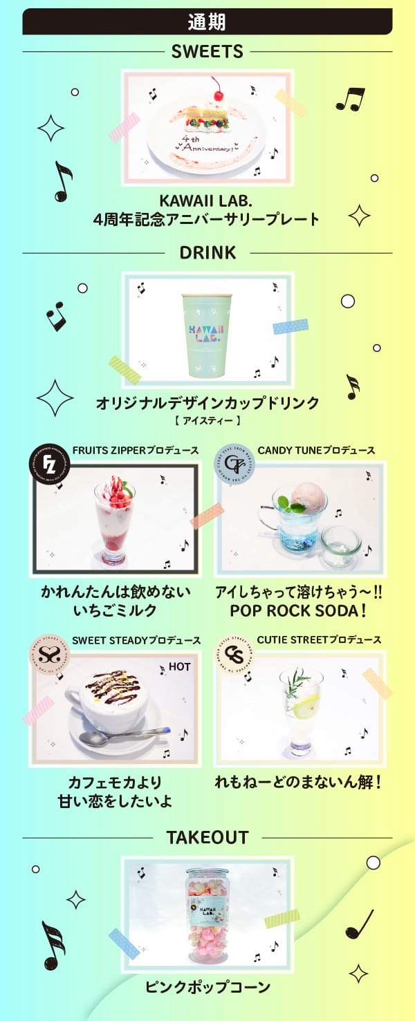 「KAWAII LAB.」コラボカフェでは、FRUITS ZIPPER・CANDY TUNE・SWEET STEADY・CUTIE STREETの楽曲やグループカラーをイメージしたコラボメニューが多数ラインナップ!