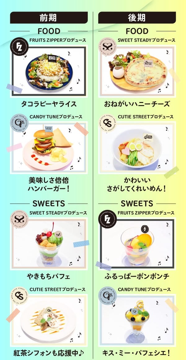 「【FRUITS ZIPPERプロデュース】タコラピーヤライス」や「【CANDY TUNEプロデュース】美味しさ倍倍ハンバーガー!」「【SWEET STEADYプロデュース】やきもちパフェ」「【CUTIE STREETプロデュース】紅茶シフォンも応援中♪」などのメニューが期間に応じて登場!