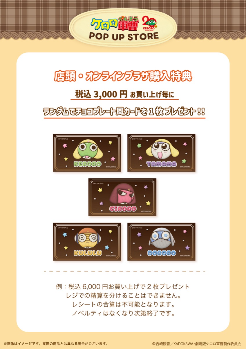 さらに、グッズをお買い上げ3,000円(税込)ごとに特典として「チョコプレート風カード 全5種」をランダムに1枚プレゼント!