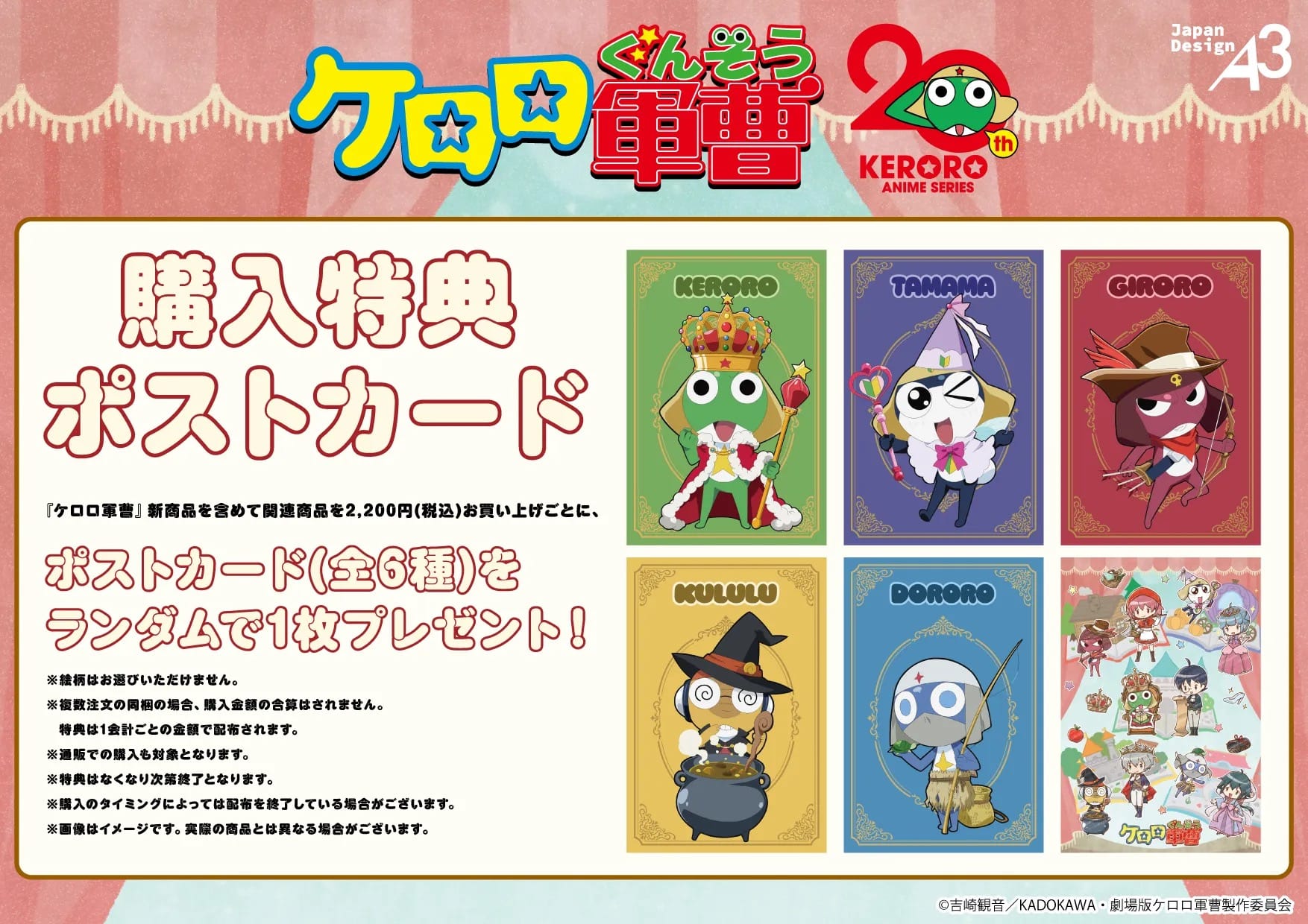 「ケロロ軍曹」ポップアップストアにて、グッズをお買い上げ2,200円(税込)毎に特典として「ポストカード 全6種」がランダムに1枚プレゼントされる。