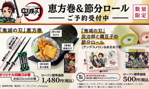 吾峠呼世晴先生による「鬼滅の刃 最終 第23巻」も発売された人気漫画を原作とし、劇場版「鬼滅の刃」無限列車編も映画公開から59日間で興行収入300億円を突破した大ヒットTVアニメ「鬼滅の刃」× ローソン全国にて2020年12月15日より「鬼滅の刃 恵方巻」「鬼滅の刃 節分ロール」が予約受付中!