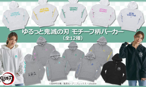 「ゆるっと鬼滅の刃 モチーフ柄パーカー」には胸元に炭治郎や善逸たちがそれぞれ描かれ袖部分にはキャラクターをイメージした模様が特徴的な「モチーフ柄プルオーバーパーカー」と胸元には5人の集合絵、背中には炭治郎・善逸・伊之助がゆるく描かれたデザインなどの「モチーフ柄ジップパーカー」が全部で12種ラインナップ!