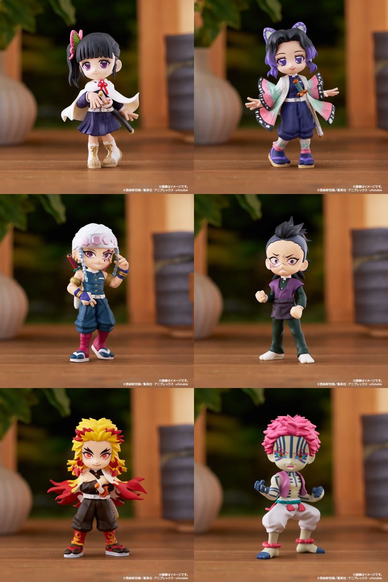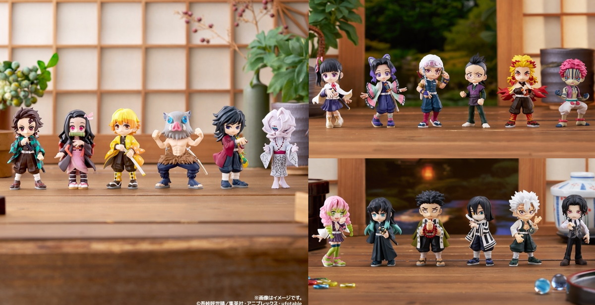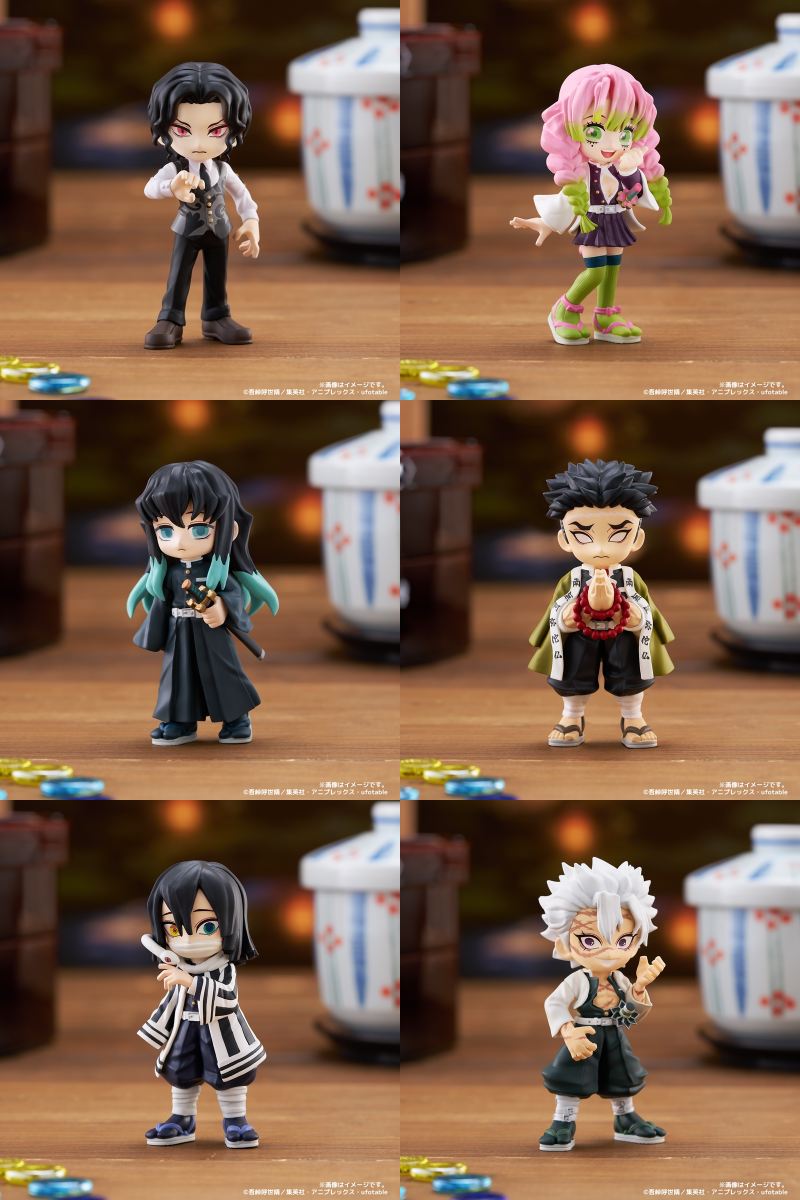 「第1弾」は、竈門炭治郎、竈門禰豆子、我妻善逸、嘴平伊之助、冨岡義勇、累の6人。「第2弾」は、栗花落カナヲ、胡蝶しのぶ、宇髄天元、不死川玄弥、煉獄杏寿郎、猗窩座の6人。「第3弾」には、甘露寺蜜璃、時透無一郎、悲鳴嶼行冥、伊黒小芭内、不死川実弥、鬼舞辻󠄀無惨ら計6人がラインナップ。