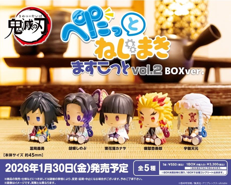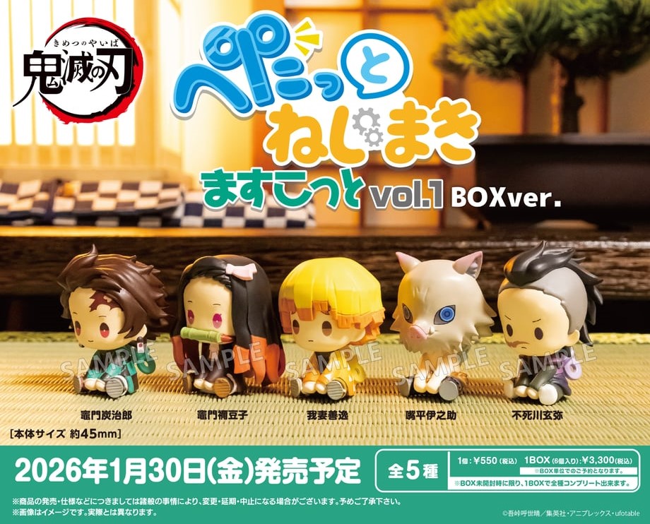 吾峠呼世晴先生による人気漫画を原作としたTVアニメ「鬼滅の刃」から、「ぺたっとねじまきますこっと vol.1 / vol.2 / vol.3」が2026年1月に発売される。
