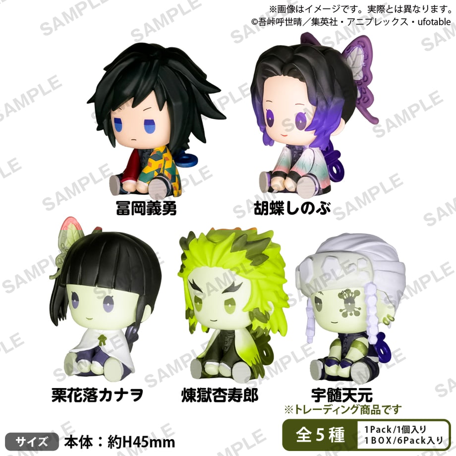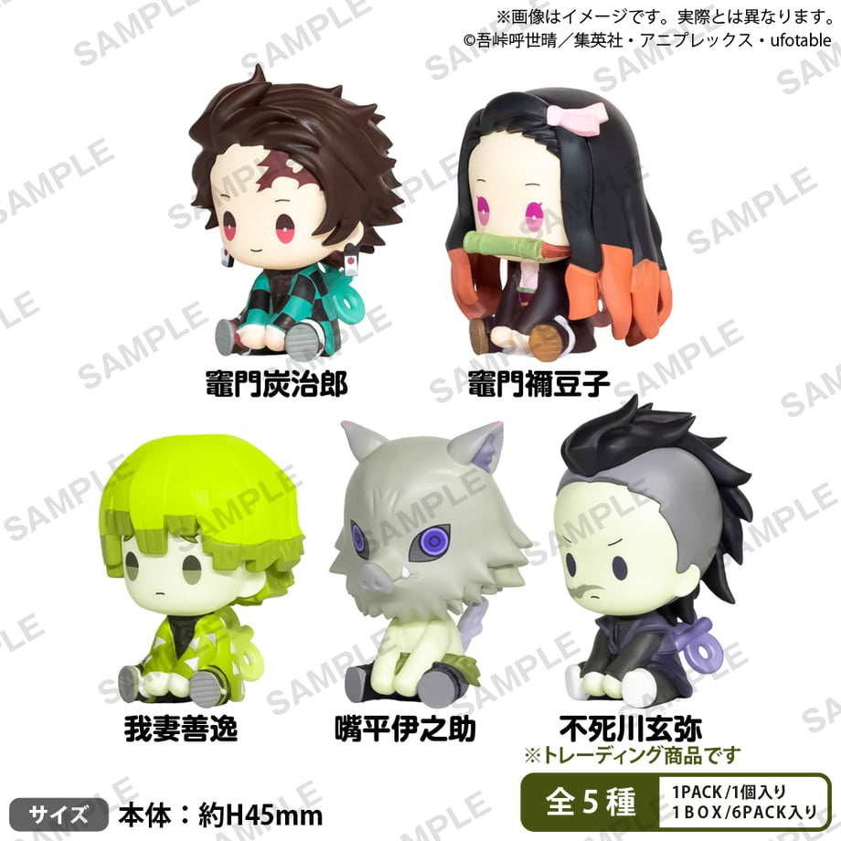 【第1弾】は、竈門炭治郎、竈門禰豆子、我妻善逸、嘴平伊之助、不死川玄弥ら5人。【第2弾】には、冨岡義勇、胡蝶しのぶ、栗花落カナヲ、煉獄杏寿郎、宇髄天元の5人。【第3弾】には、甘露寺蜜璃、時透無一郎、悲鳴嶼行冥、伊黒小芭内、不死川実弥 らそれぞれ3種類のBOXがラインナップ。