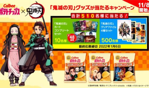 2021年11月8日より数量限定で発売される「ポテトチップス 鬼滅の刃 コンソメ無限パンチ」を含む対象商品を3袋購入し、スマートフォンで応募すると、11月30日から発売される「鬼滅の刃チップス」のカード全48種のコンプリートセットを抽選で10名、「鬼滅の刃」クリアファイル4種セットを抽選で500名にプレゼント!