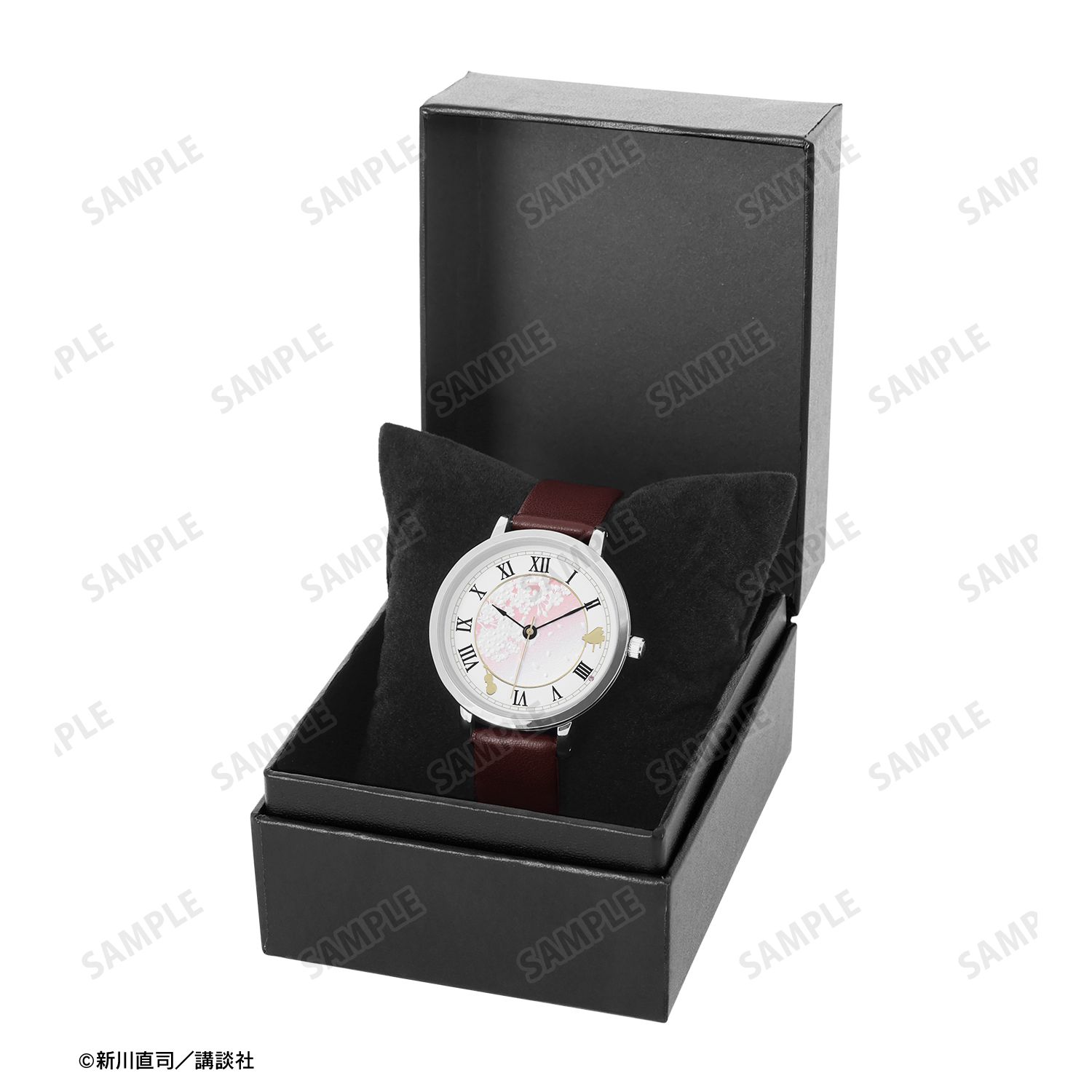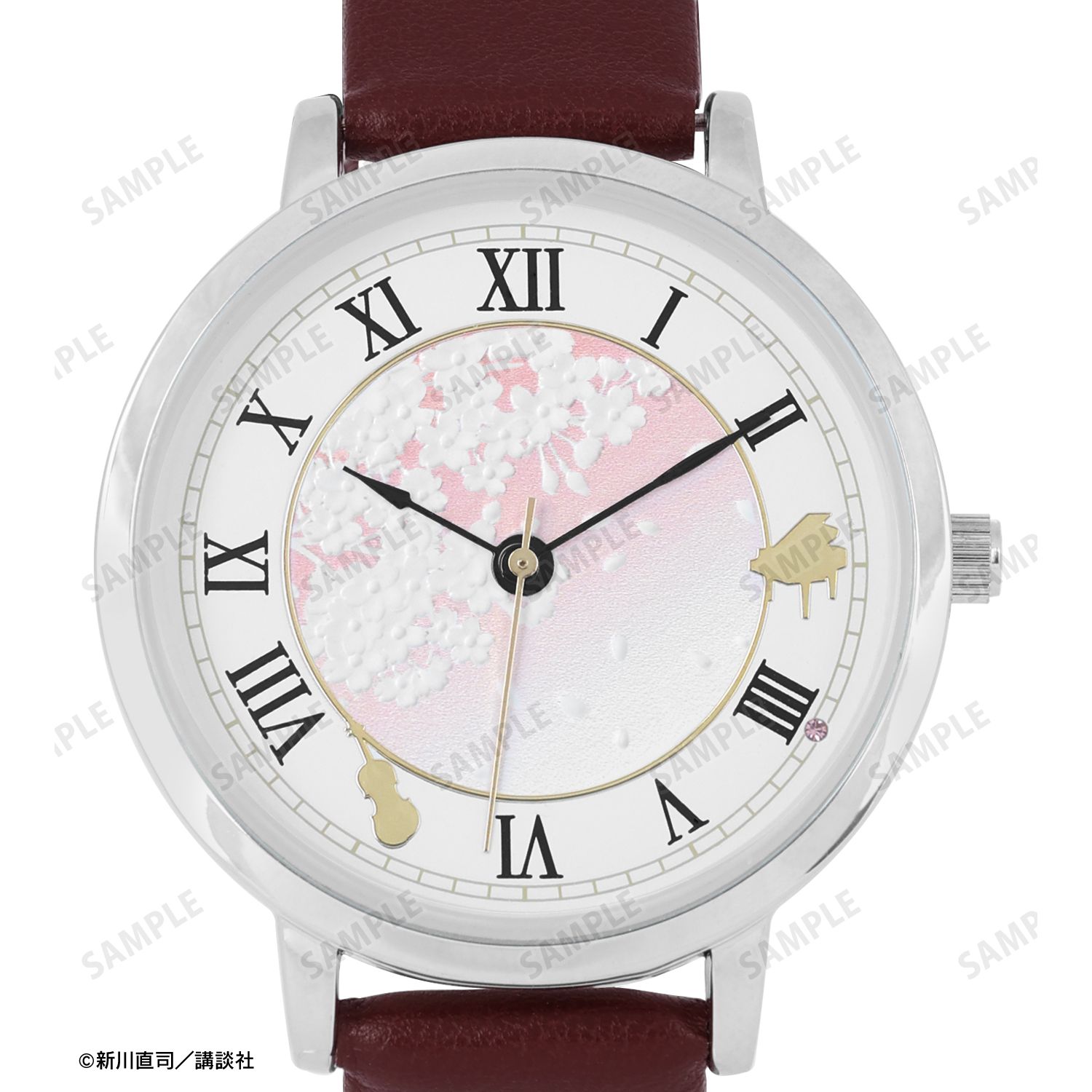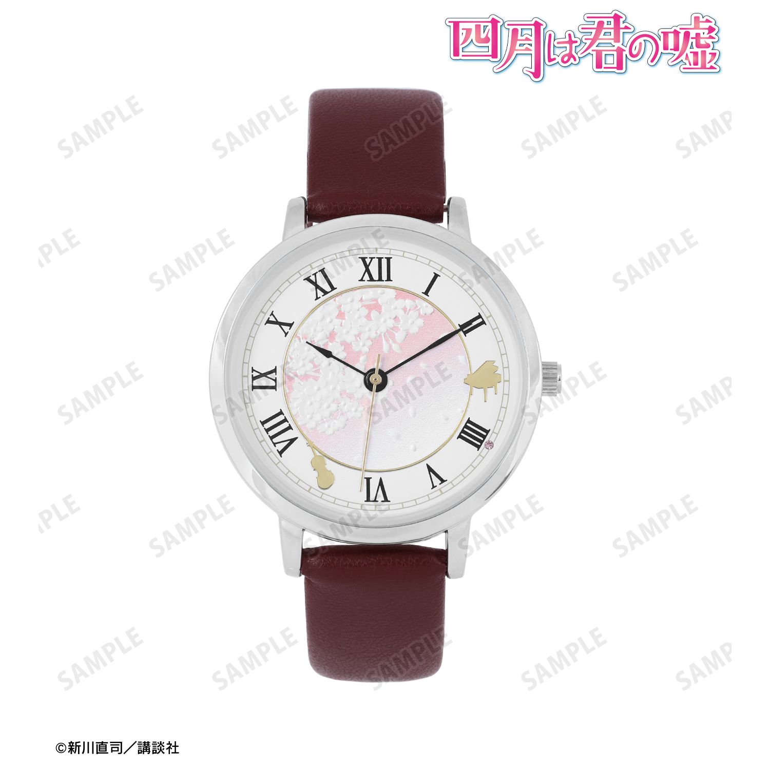 君嘘ファン必見! 作品の世界観を表現した「腕時計」が新登場。 文字盤には、ピアノやヴァイオリンのモチーフを配置し、中心部分は桜柄のエンボス加工をデザイン。