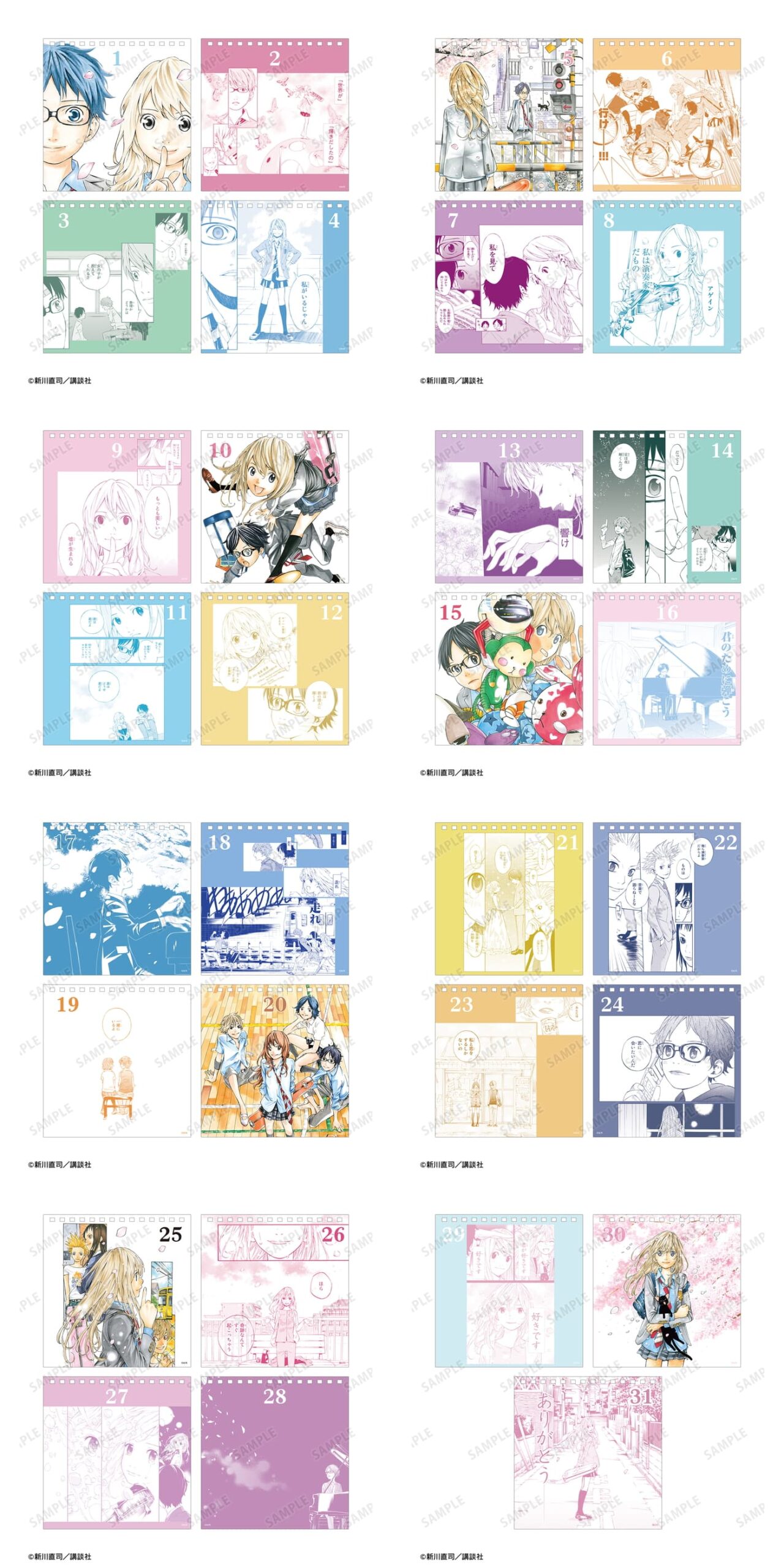 有馬公生、宮園かをり、澤部椿、渡亮太、相座武士、井川絵見、相座凪の原作コマイラストを日替わりでお楽しみいただける日めくりカレンダーに仕上げました。