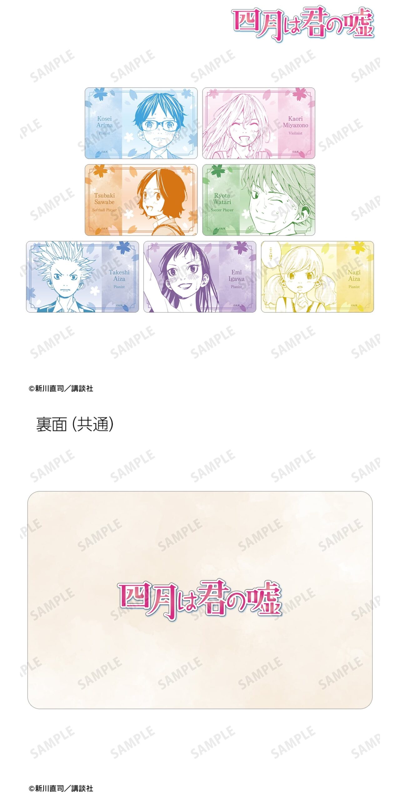 有馬公生、宮園かをり、澤部椿、渡亮太、相座武士、井川絵見、相座凪の原作コマイラストをプラスチックカードに仕上げました。